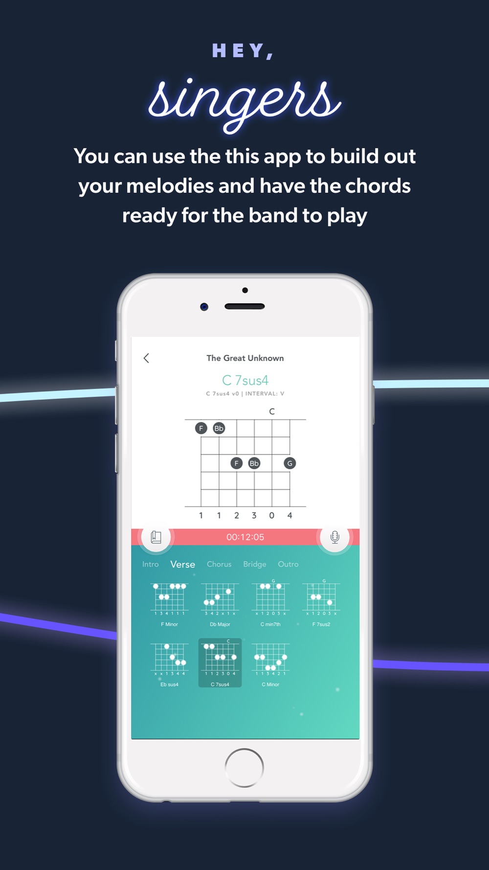 Song™ gets you into a place of easy experimentation and songwriting creativity by opening the floodgates of amazing chords you never even knew existed! create the structure, add lyrics, and make a recording...it all stays organized neatly for you.