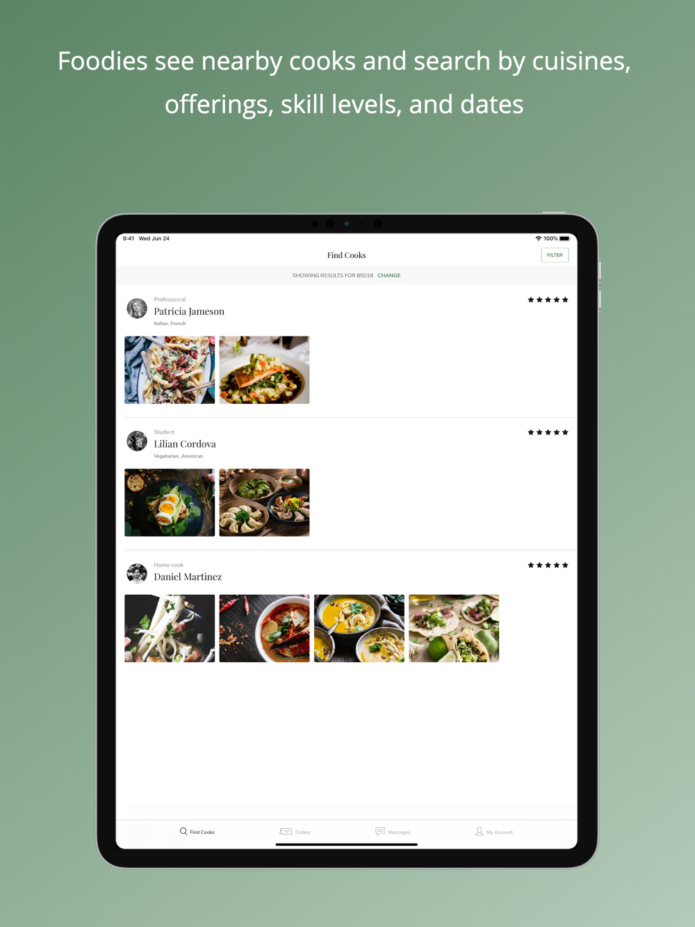 We help foodies find local cooks of all skill levels who offer a variety of affordable farm-to-table meals anywhere. Choose from meal prep services, drop-off meals, in-home dining experiences, and interactive classroom lunches. No tip, no tax, no service charge, and no delivery fee.