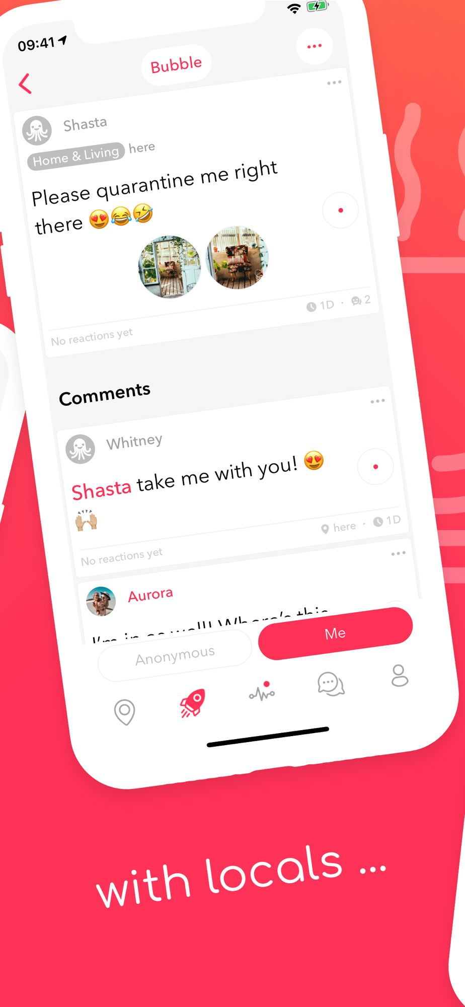 Communicate with people nearby. Share your experiences, thoughts, emotions and activities with people just around the corner.