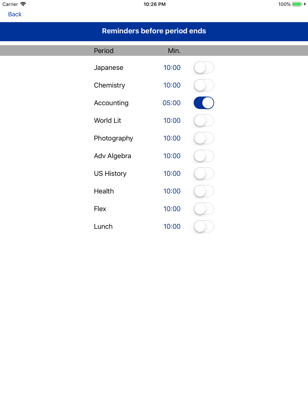 - Widget showing the current or upcoming period, and the number of minutes till the start or end of the period.