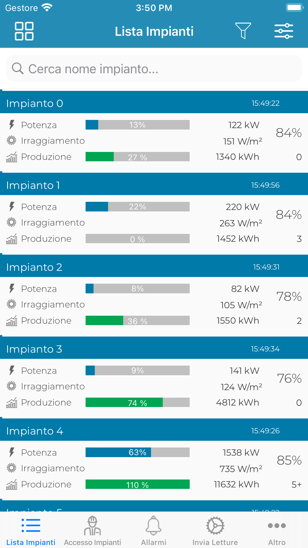 Rielaborando tutte le informazioni acquisite dai sensori ambientali e acquisendo tutti i parametri elettrici dei componenti installati (contatori, inverter, interruttori, ups, solarimetri ecc... ), ti consente di valutarne in tempo reale l’effettivo livello di performance, fino a conoscere la power ratio di ogni singolo inverter di stringa.