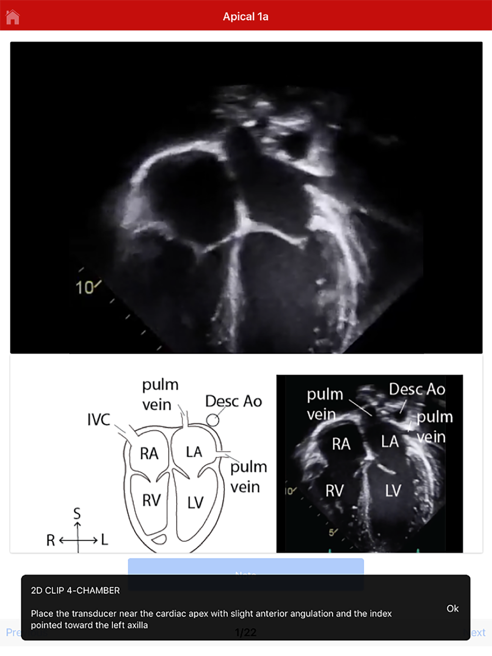 The exact images and the order in which the images and views are obtained varies by institution. Each protocol (subcostal, parasternal, apical or suprasternal) can be followed in order by clicking on the next tab at the bottom of the page or you can click on an individual numbered view within the protocol list to be taken directly to that view. The name of the view and instructions will pop-up automatically at the bottom of the page. The instructions and additional notes can also be found in the “NOTE” button at the bottom of the page.