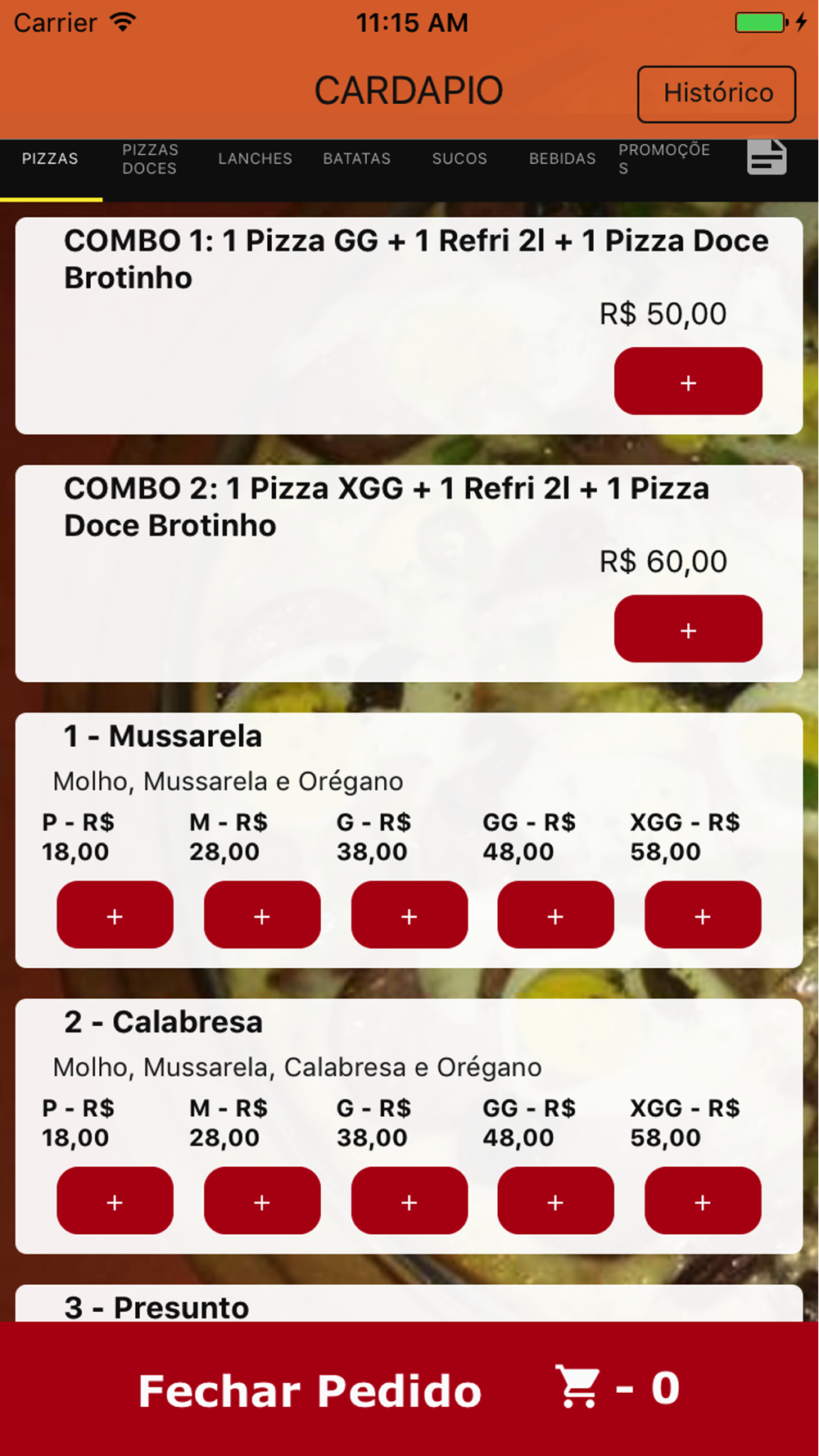 Veja todo o cardápio e faça seu pedido diretamente pelo aplicativo, você também tem acesso a um histórico de seus pedidos para checar os pedidos feitos e também conseguir refaze-los.