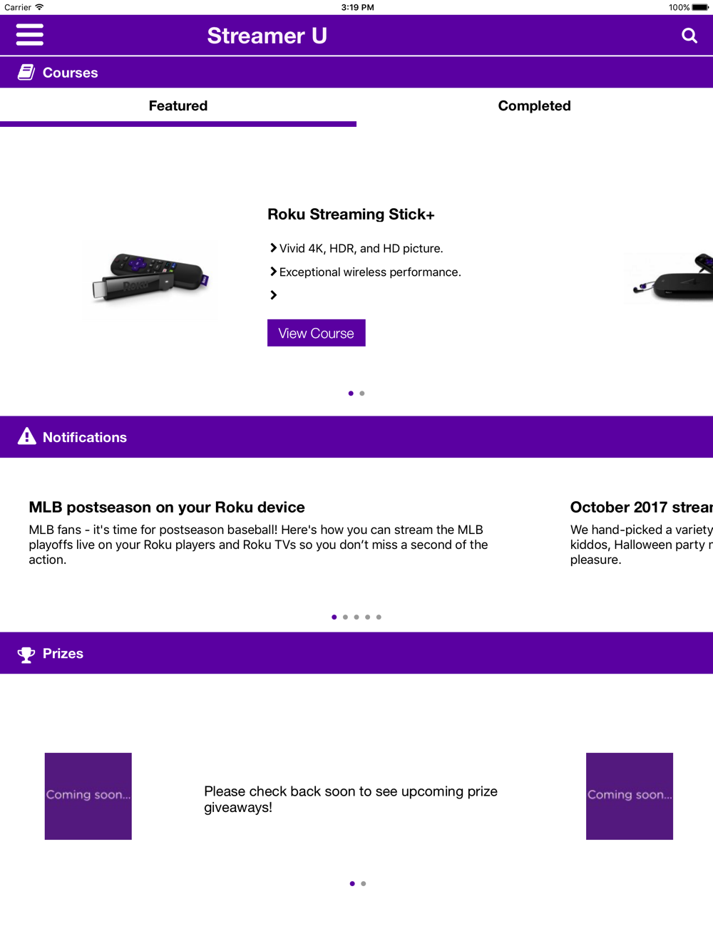Streamer U is an interactive mobile learning platform by Roku. Sales associates learn about Roku's line of products, take quizzes, seek assistance, and have the chance to win prizes.