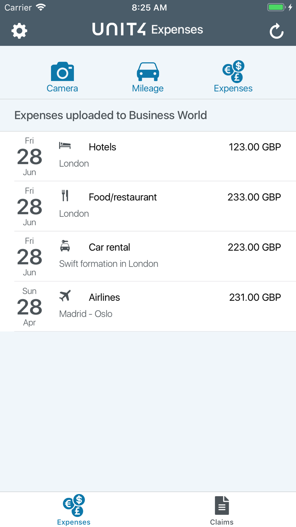 Unit4 Expenses is an easy tracker for business expenses. It lets you track any kind of expense as well as mileage. Just snap a photo of any applicable receipts and your expenses will automatically be created for your expense report, based on the results from the Unit4 Receipt Recognition Service (URRS). Your expenses and mileage logged with the Expenses App is automatically synchronized with the Unit4 back-end where you can further process and submit them in a claim form.