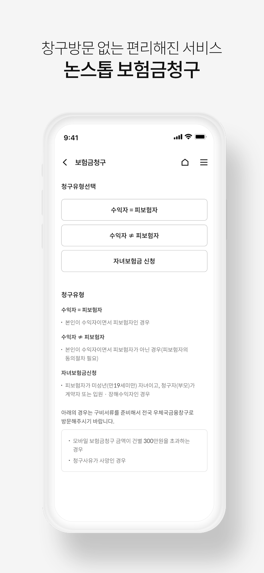 - 보험금청구, 지급신청, 지급과정조회, 예상보험금 조회 등 지급관련 서비스를 모바일을 통해 진행할 수 있도록 기능 제공