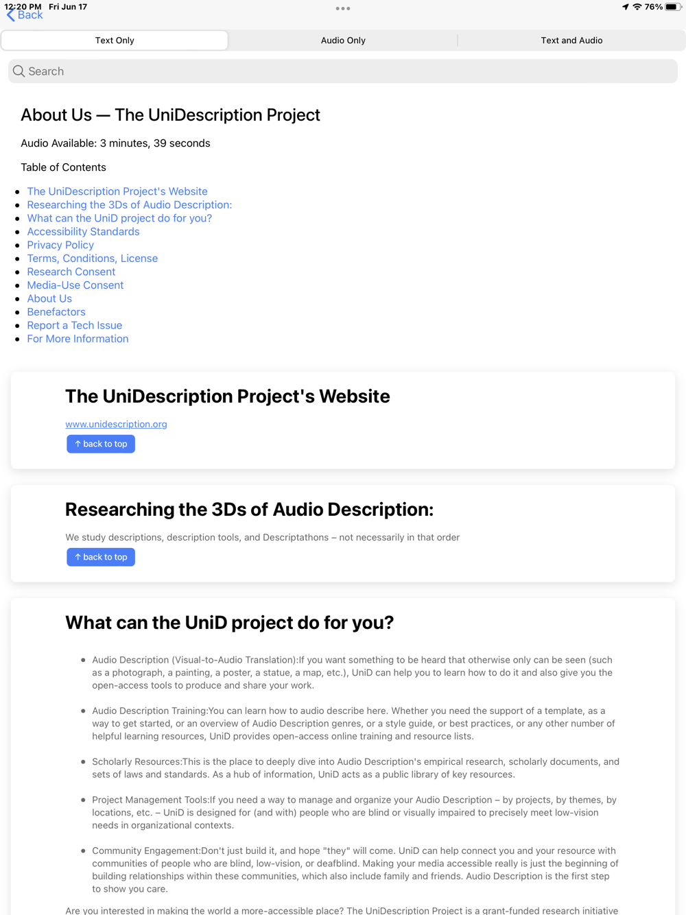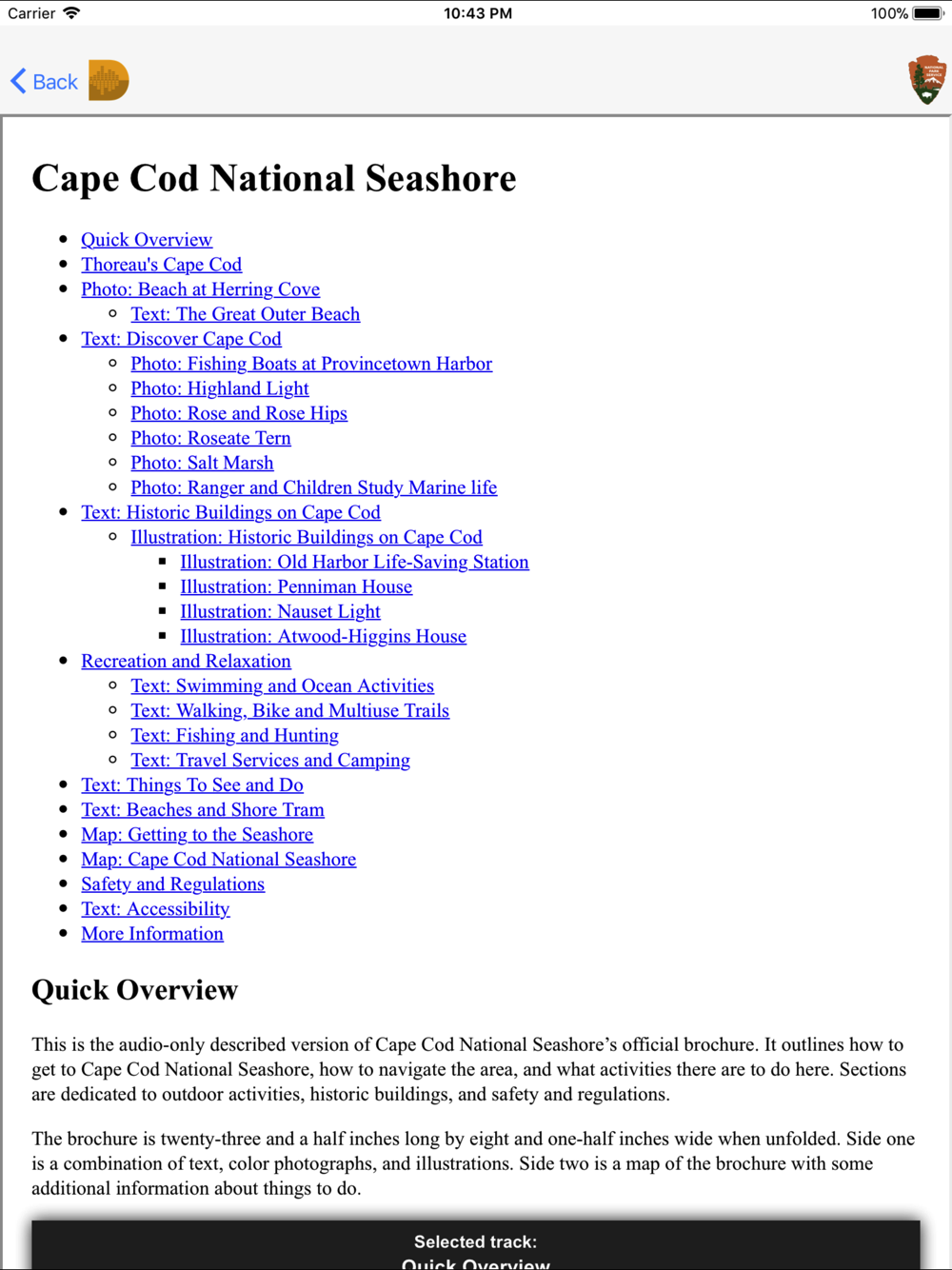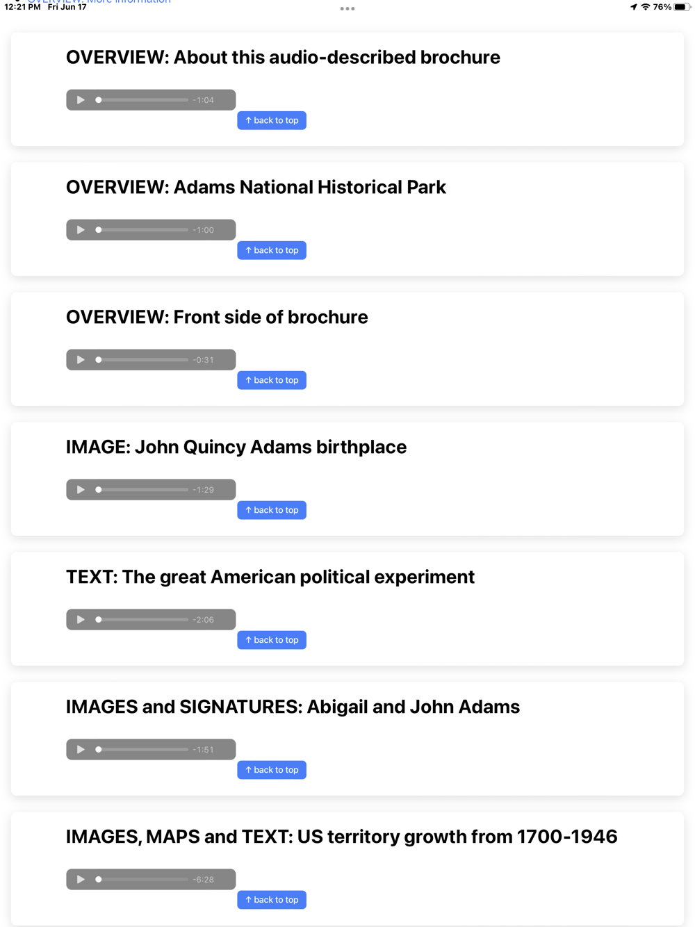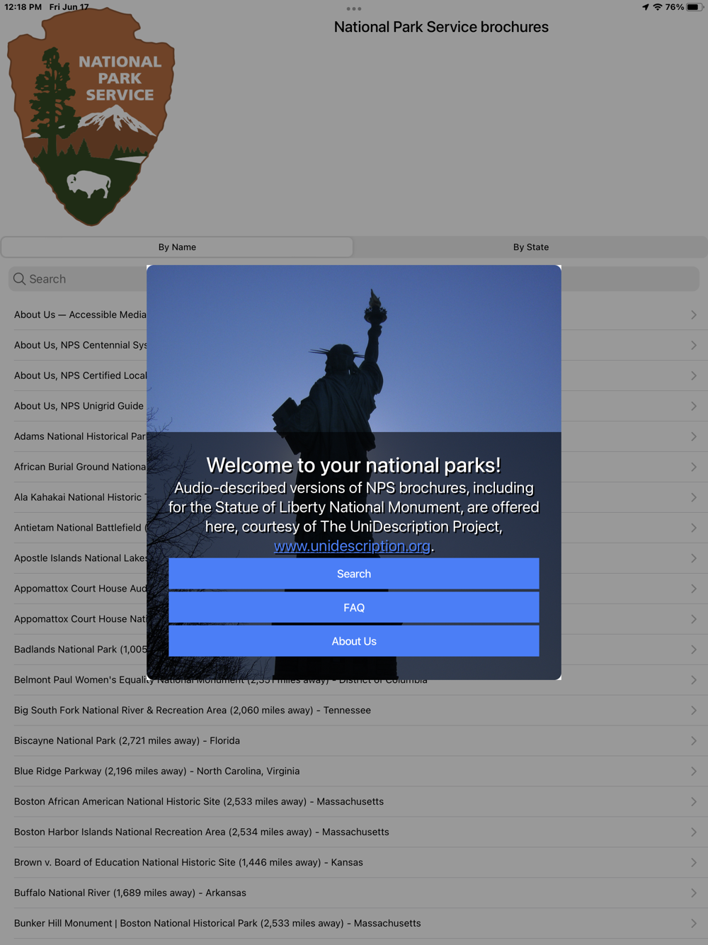 This app shares prototype audio description from dozens of National Park Service sites throughout the country, translating their paper brochures into acoustic media, designed for people who are blind, visually impaired, print dyslexic, or who prefer learning through sound.