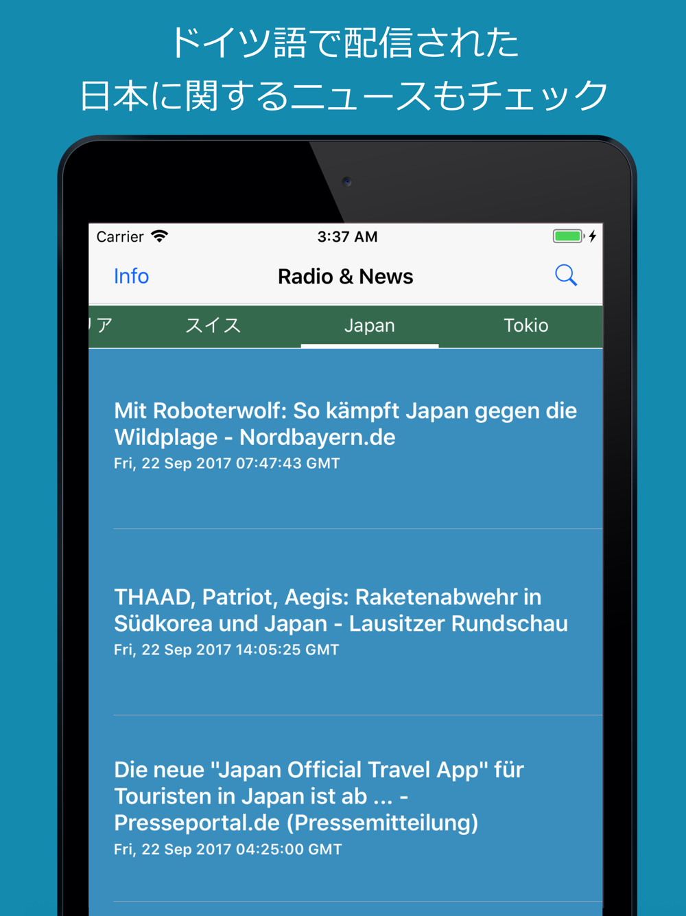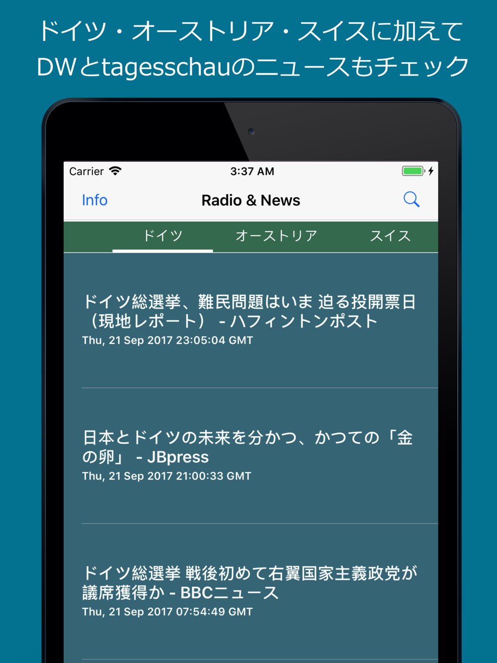 ドイツ・オーストリア・スイスのニュースを日本語とドイツ語でチェック、ラジオ機能付きでいつでもどこでも3カ国の最新情報を収集可能!