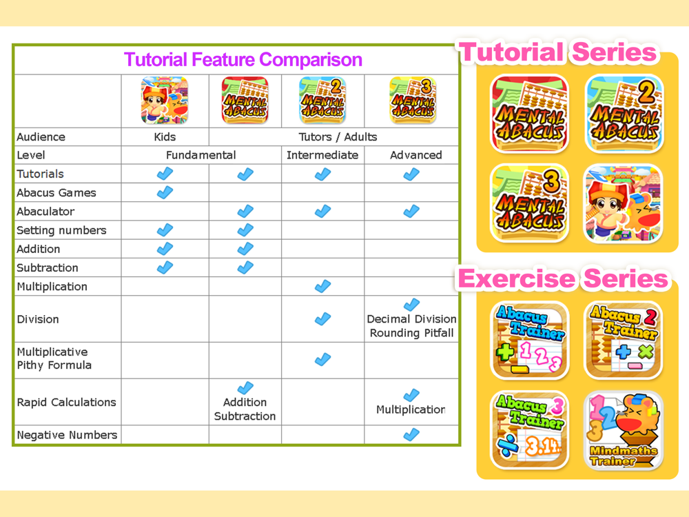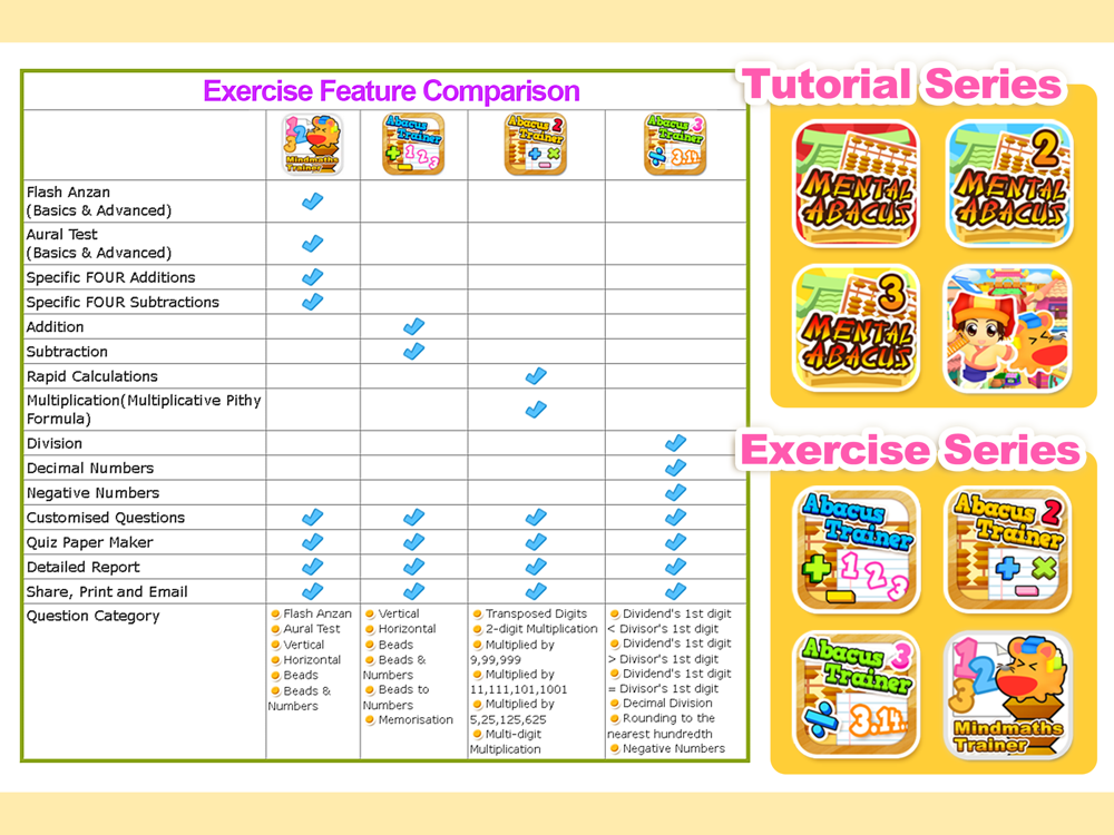 Mind Maths encourages children to acquire the knowledge through a series of interactive lessons(English Dubbed and Subbed), and attain fruitful drillings and exercises via games, getting rid of the dullness at the same time. It is widely adopted and welcomed by parents and children as the first step on the road to Abacus.