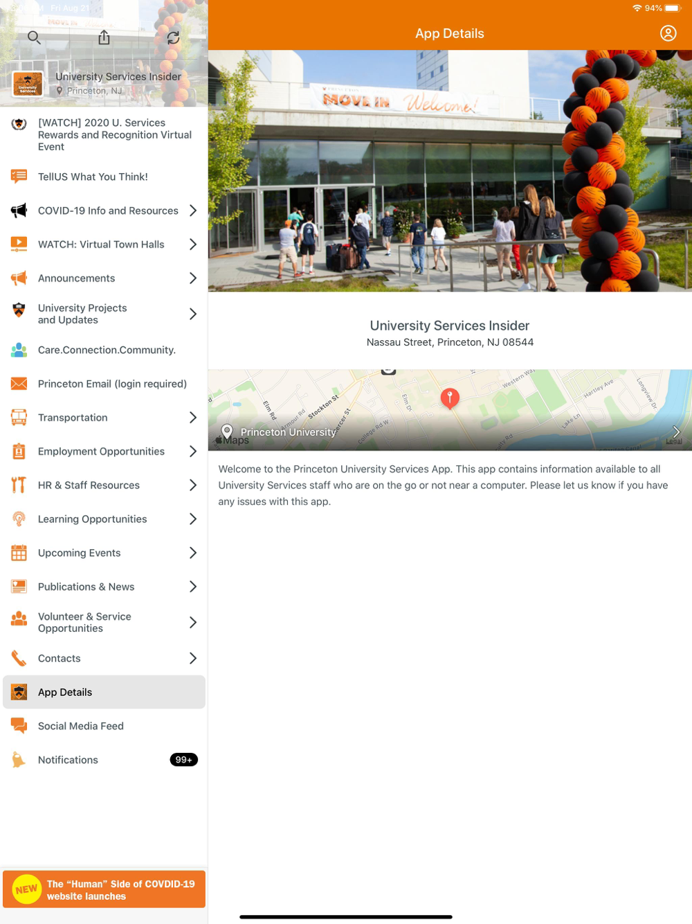 The Princeton University Services Insider App contains information and news to all University Services staff members.