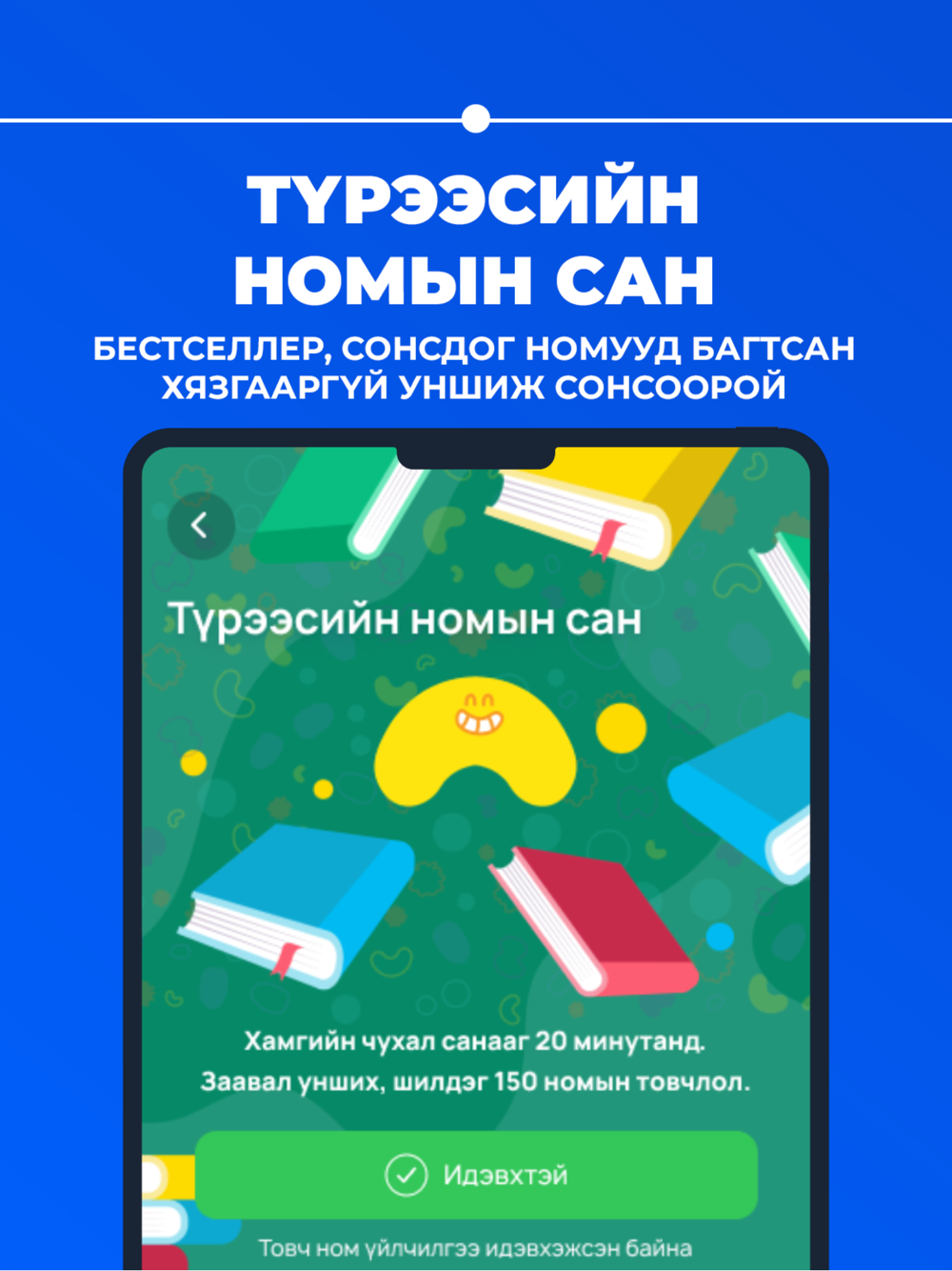 Та бидний санал болгож буй Түрээсийн номын сан үйлчилгээг туршаад үзээрэй. Энэхүү үйлчилгээ нь олон улсын болоод дотоодын бестселлер номуудыг аудио болон цахим хувилбарыг санал болгох болно. Үүгээр бид дараах боломж, үнэ цэнийг танд хүргэж байна.