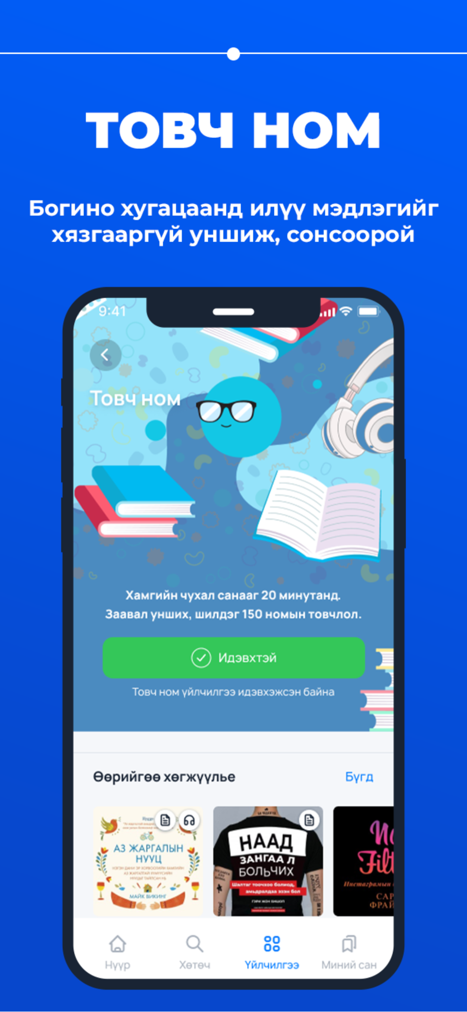 Товч ном - 200 гаруй бестселлер номын товчлол багтсан, нэг түрээслээд хязгааргүй унших, сонсох боломжтой. Цахим ном - Унших цагаа уртасгахад танд тусална Тантай үргэлж хамт явах гар утас эсвэл таблетандаа хүссэн номоо, хүссэн хэмжээгээрээ хадгалж, хүссэн үедээ унших нь гайхалтай биш гэж үү. Багахан цаг зав гарахад л амтанд нь орсон зохиол, бүтээлээ үргэлжлүүлэх нь таны хором мөч бүрийг илүү үнэ цэнтэй болгоно.