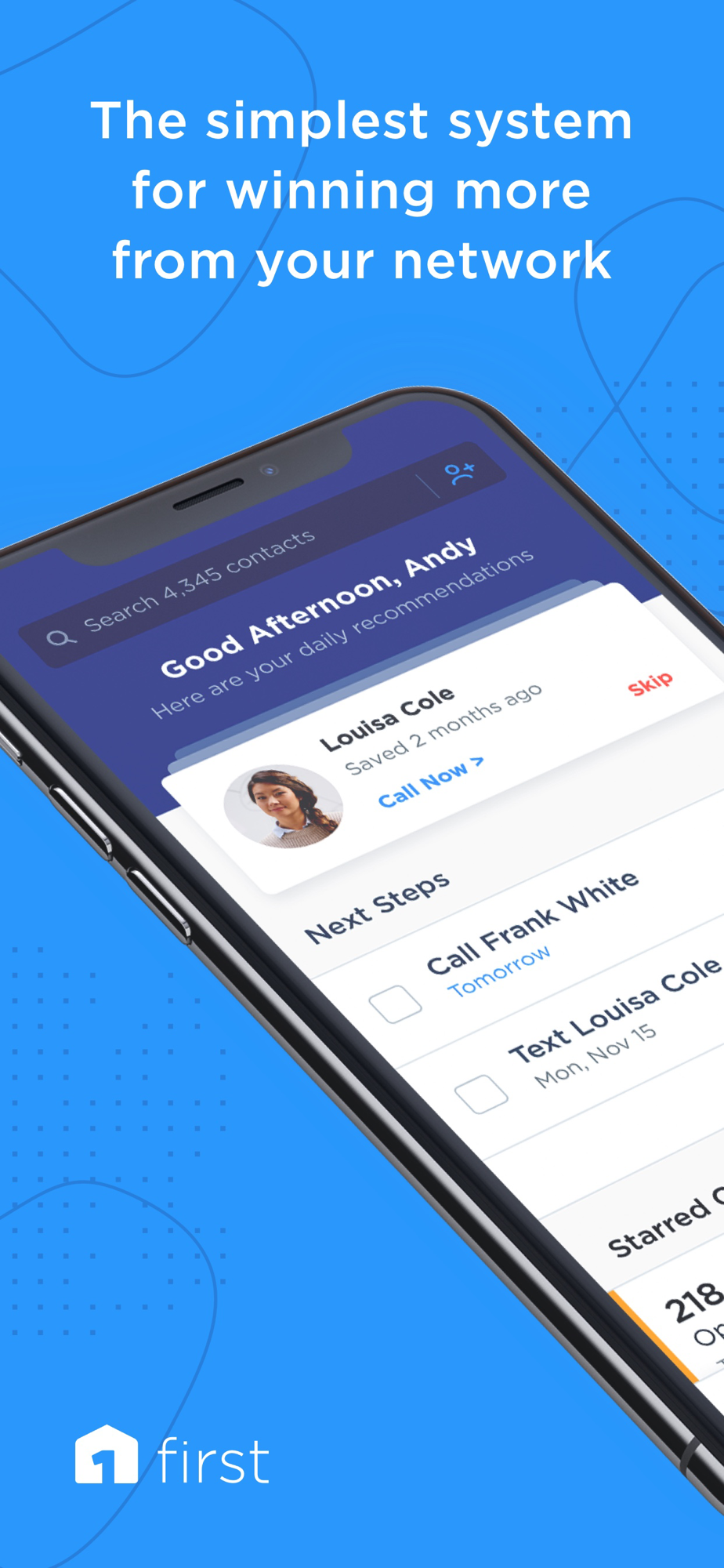1) A simple view of your personal network - Quickly sync your phone and email contacts, then let First provide an enhanced, organized, and more complete view of your personal network.
