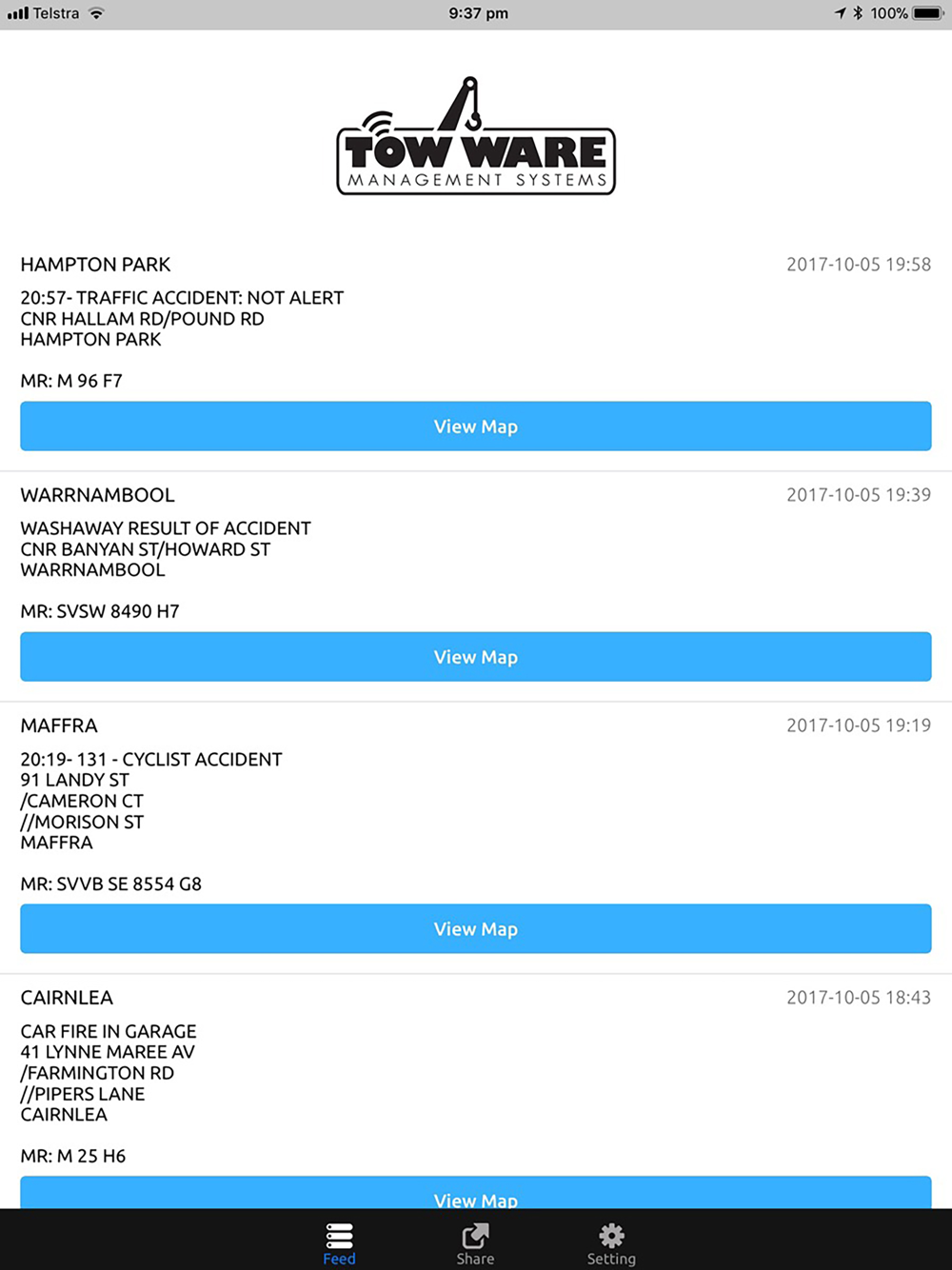 Tow Ware: Traffic Accident Alert Service - servicing Queensland, Victoria and South Australia. Receive up to the minute traffic accident alerts.