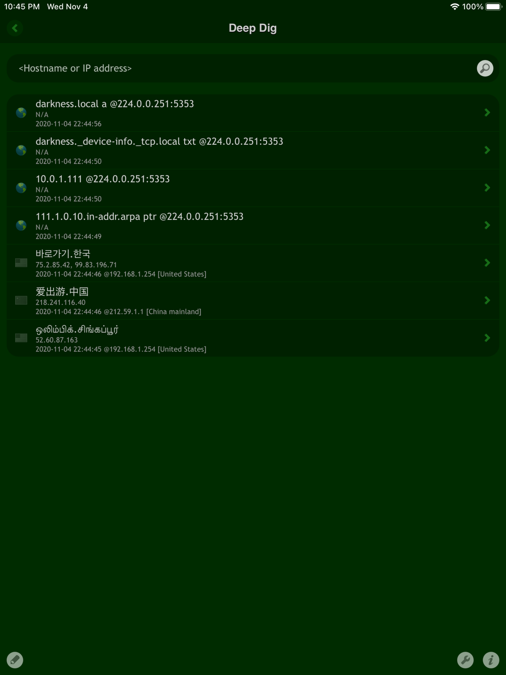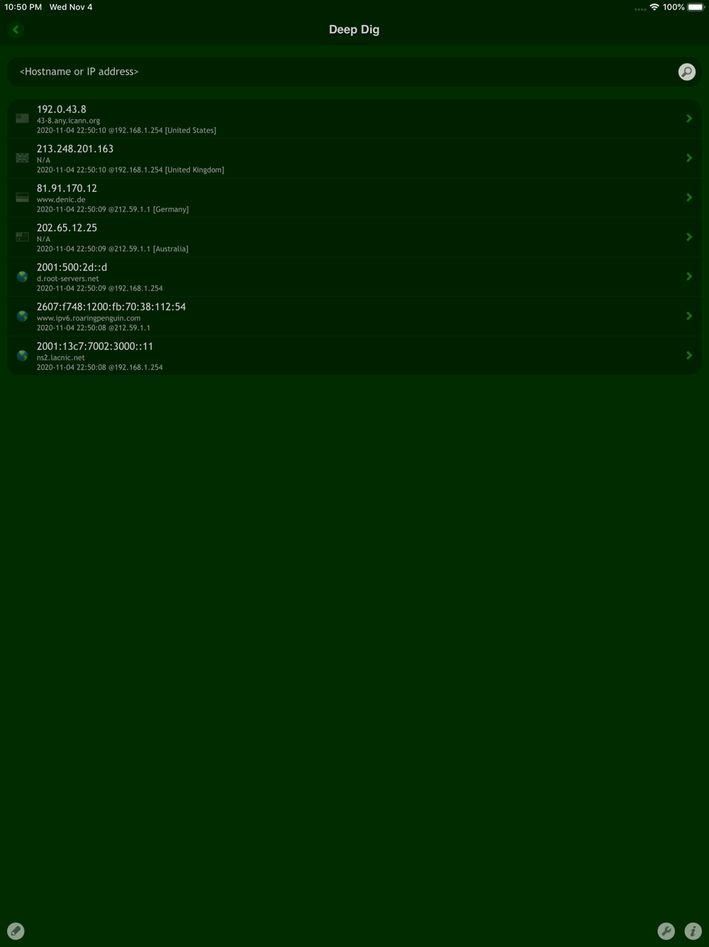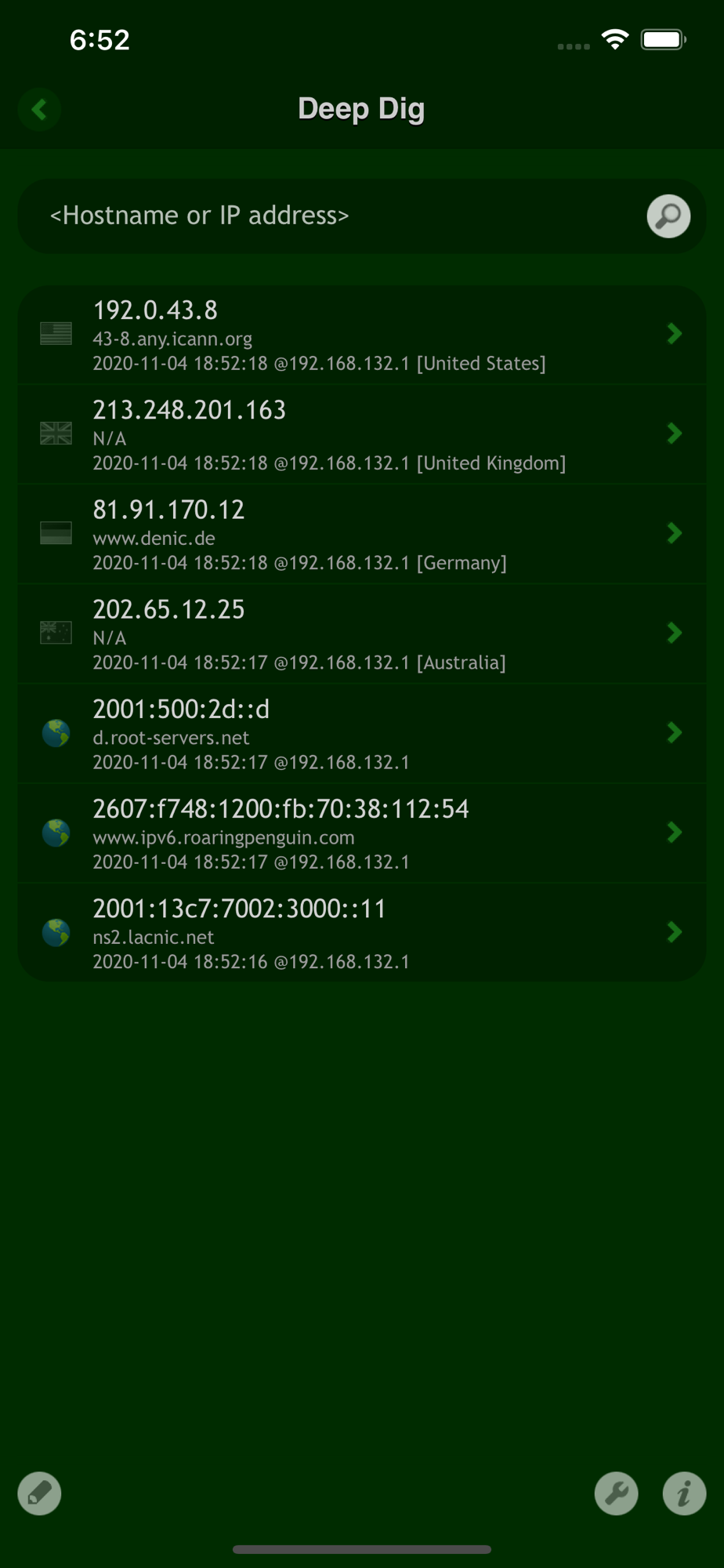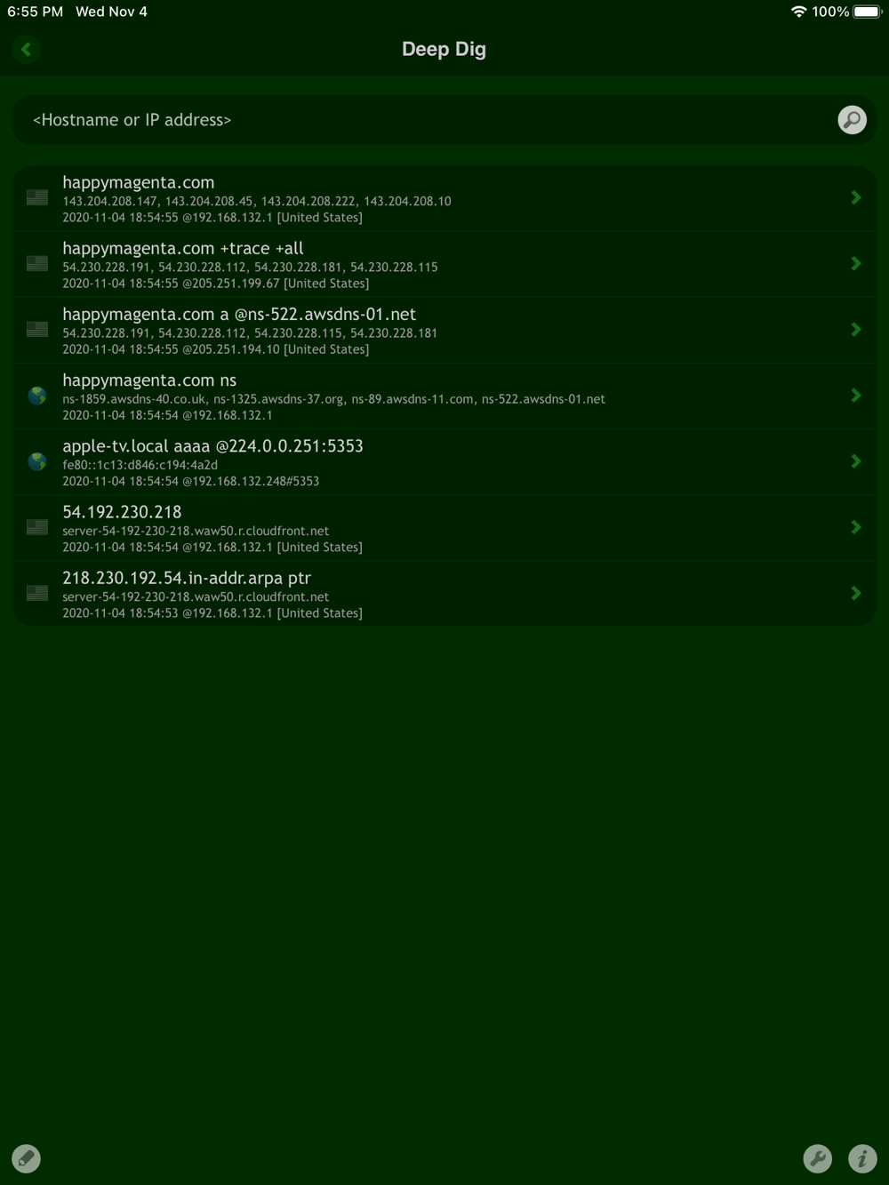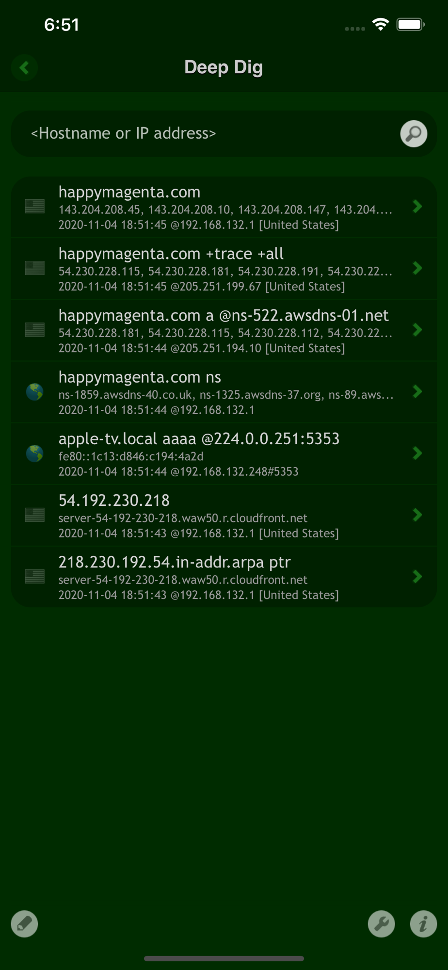 Deep Dig is an advanced DNS lookup utility with DNS trace support and history. With it you can quickly lookup DNS records by simply specifying record types, custom servers, ports, and other options right in the query, like you do in the dig command line utility.