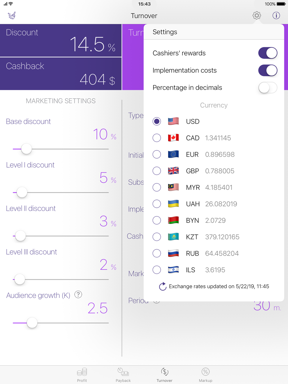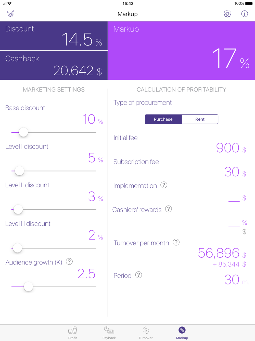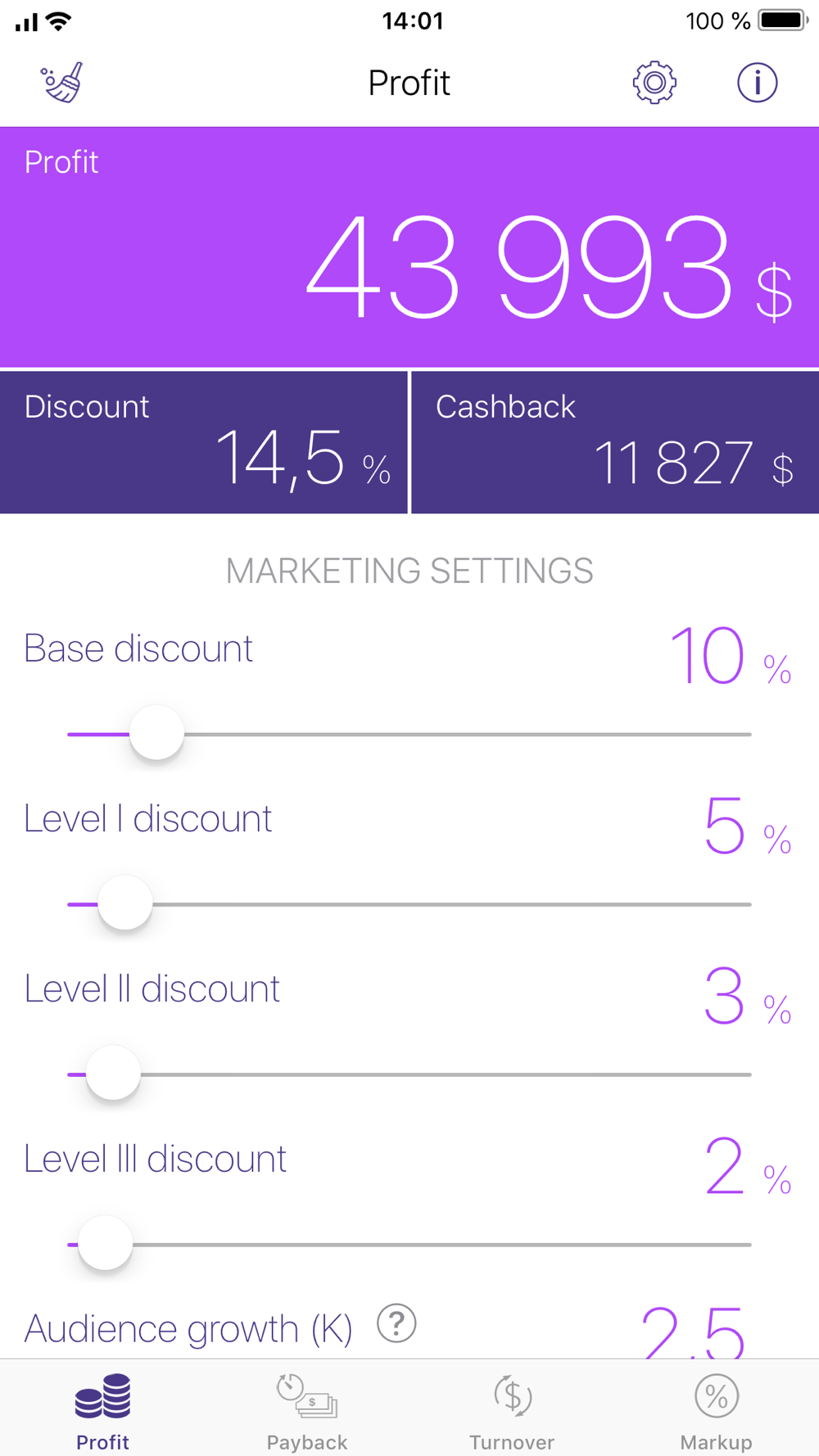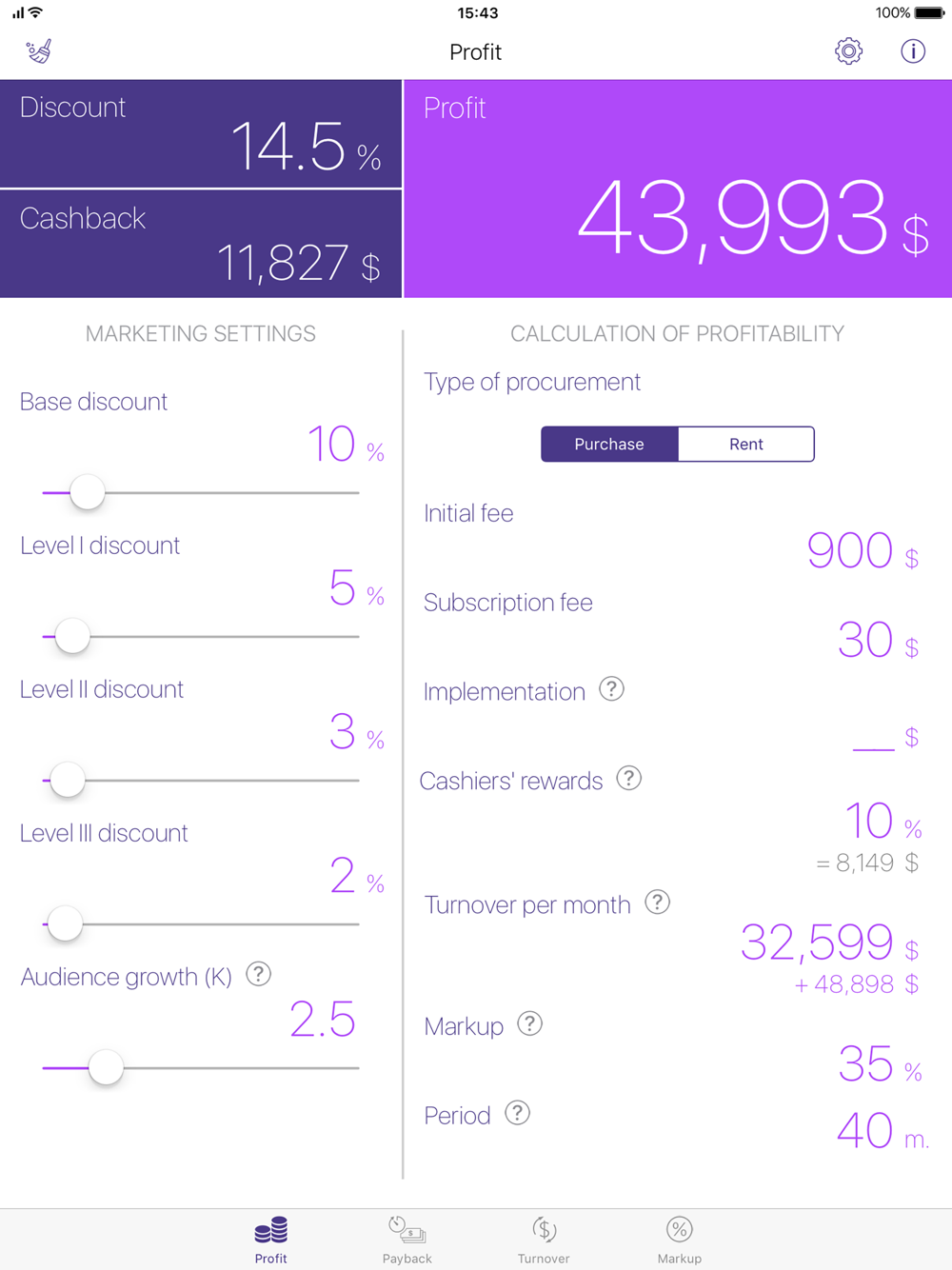 The UDS Marketing Calculator allows you to calculate the size of the average UDS discount and the profitability of the bonus program for various marketing settings and financial indicators pertaining to your business, so that you can estimate under what conditions the costs invested in a bonus program will pay off.