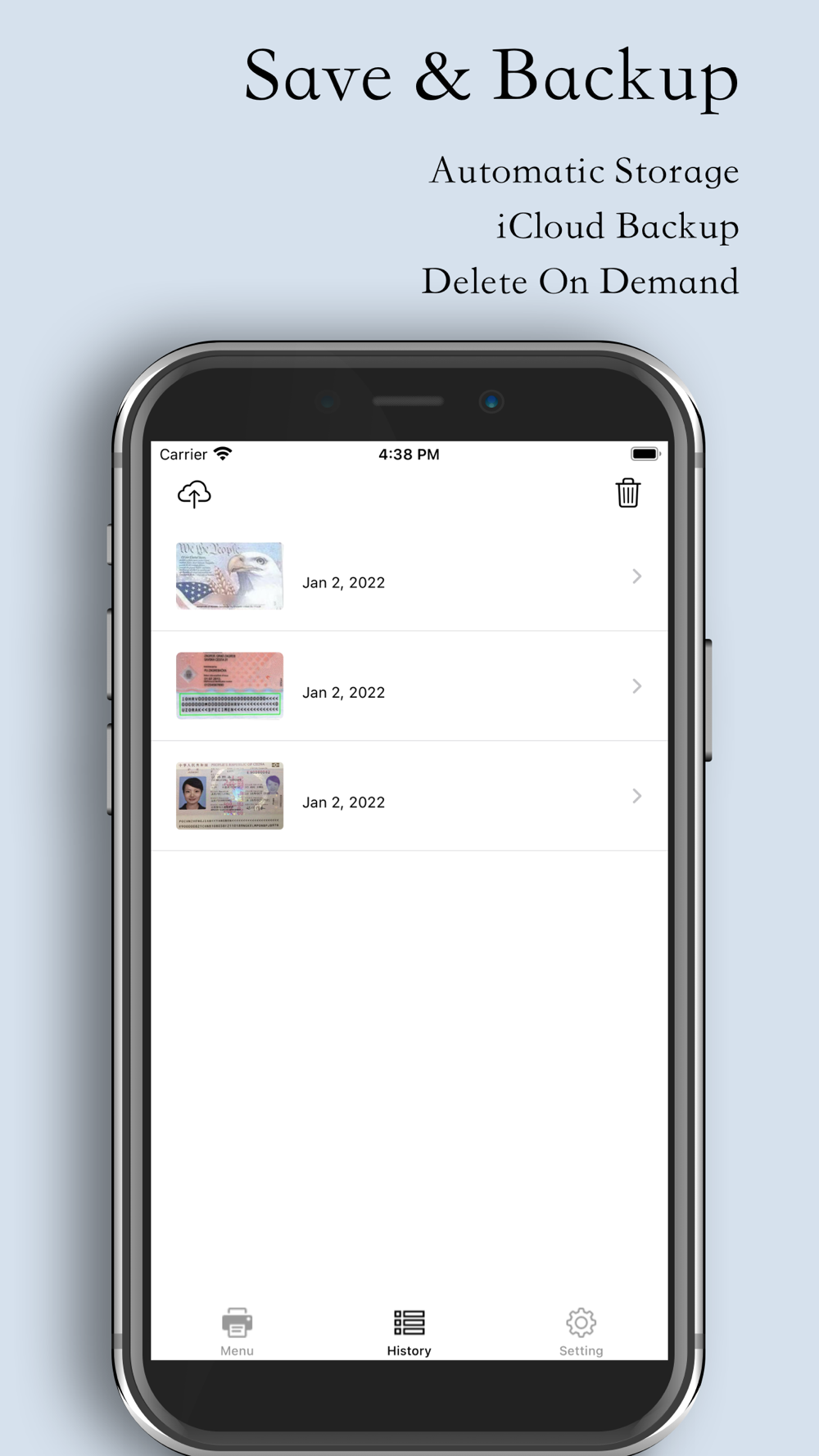 After version 2.2, the iCloud backup function was added at the request of some users. The technology used was provided by Apple CloudKit. For ID pictures generated before version 2.2, users need to manually open the pictures to be backed up once, and then perform iCloud backup. The picture files backed up to iCloud can be seamlessly viewed and used using the "File" that comes with iOS or the Finder (Go->iCloud Driver) that comes with Mac.