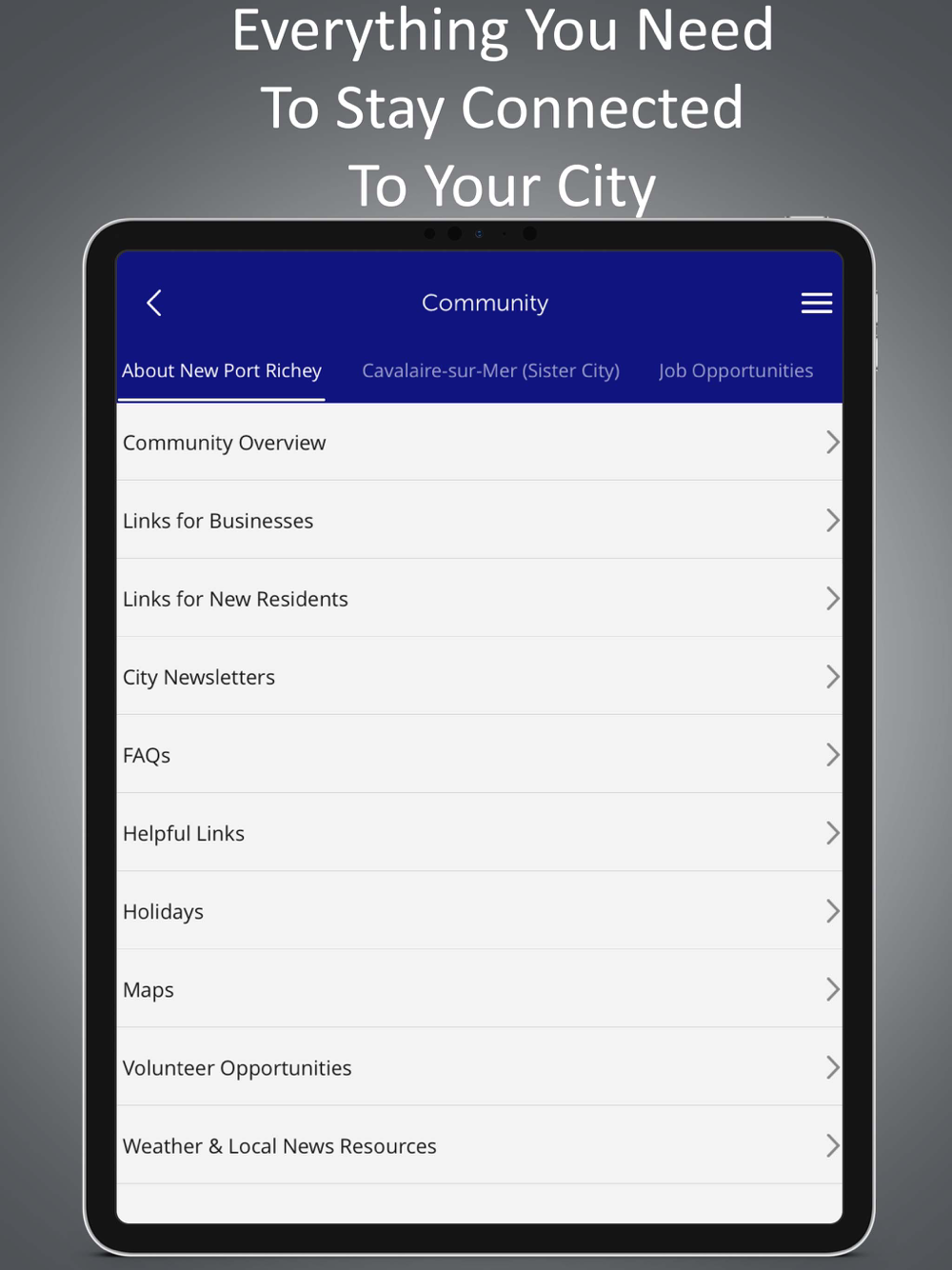 Connect with your city by downloading the official City of New Port Richey app. Report and track issues directly to the city staff and departments, discover parks and amenities accross the city, find department contact information and addresses, stay up to date on upcoming community events and news.