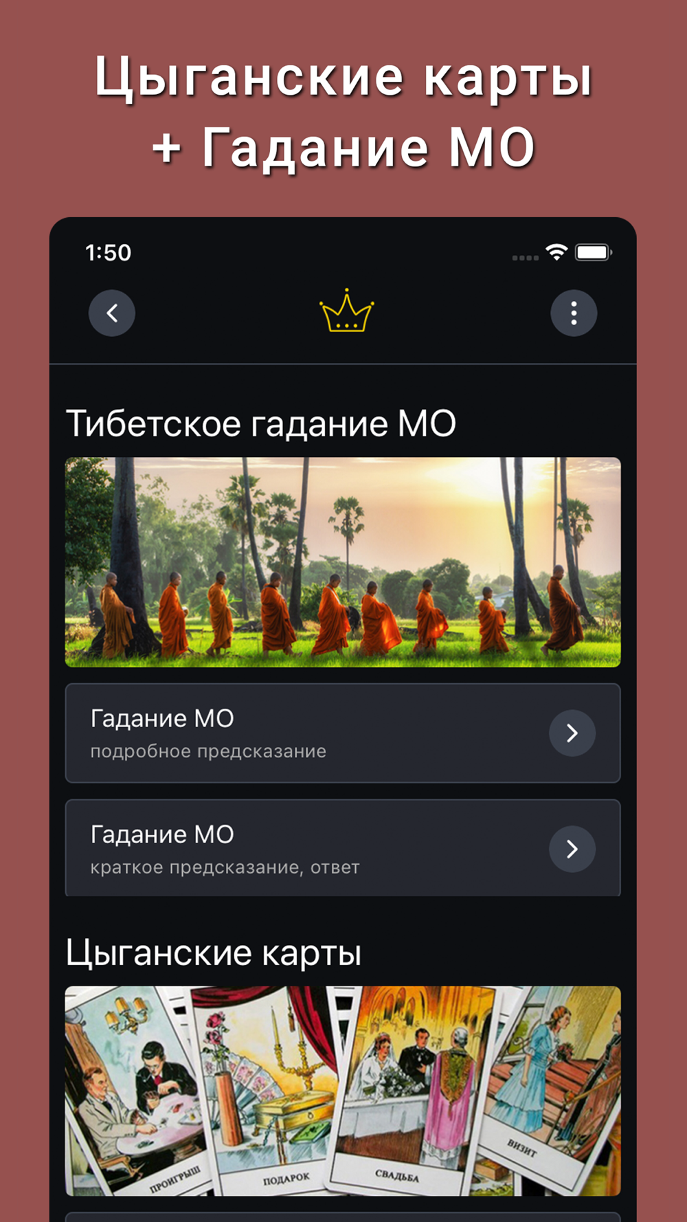 Все карточные гадания приложения работают по тому же принципу, что и реальные гадания на игральных картах.