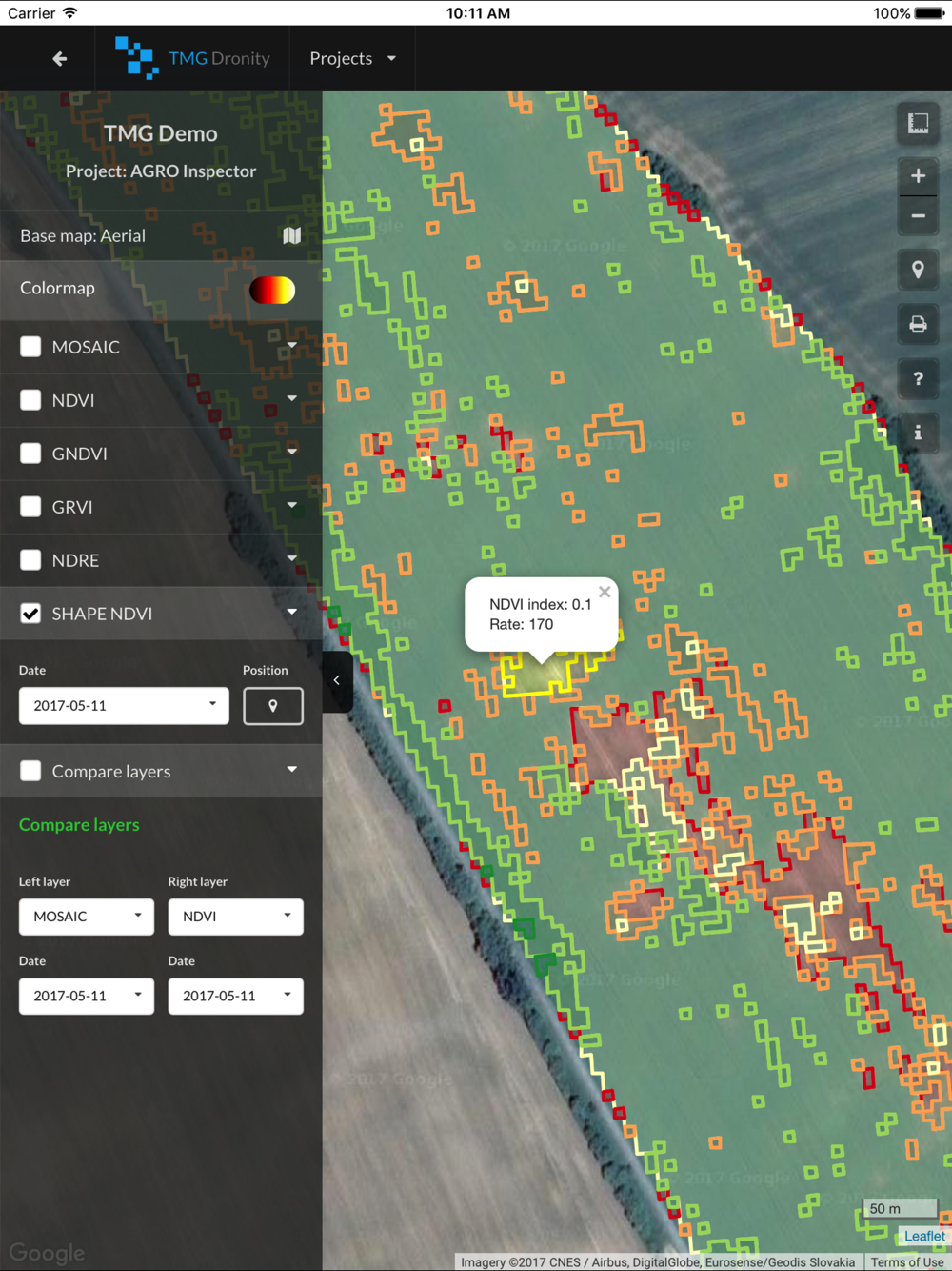 AGRO Inspector analyzes multispectral and RGB data from drones and aircraft captured images. It gives you access to your data anytime, anywhere from your device. Recommended for drone owners, farmers and insurance companies for recognising potential damage to crops (like wheat, corn, oil seed rape).