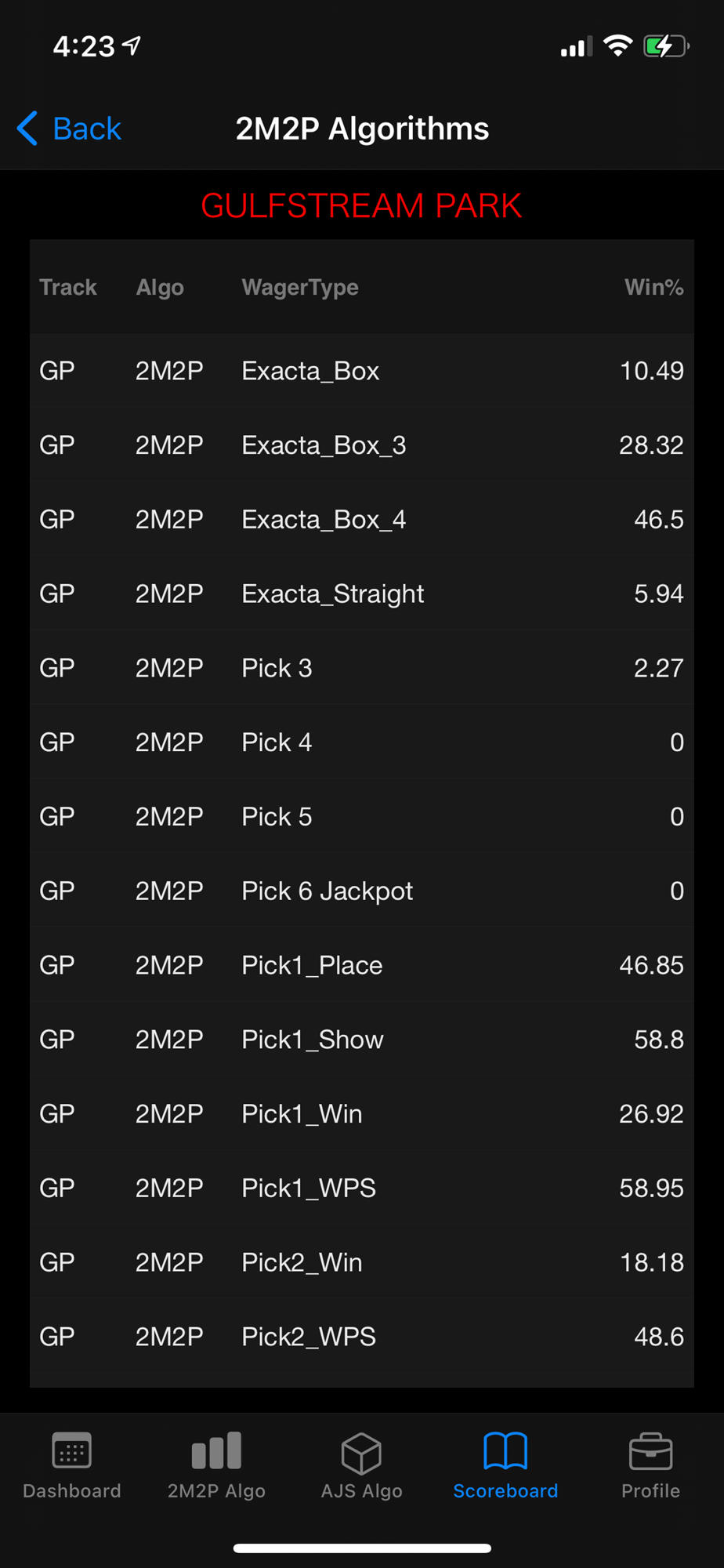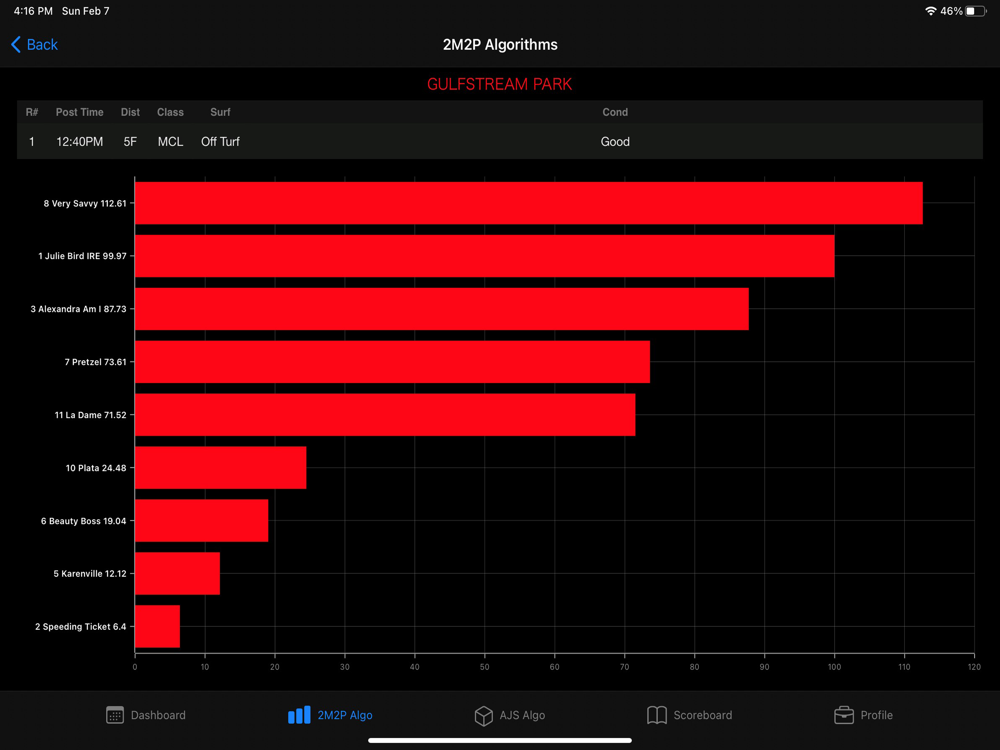 The best in horse racing algorithm prediction, featuring two sets of algorithm picks and real-time scoreboard of hit percentages per exotic wager and track.