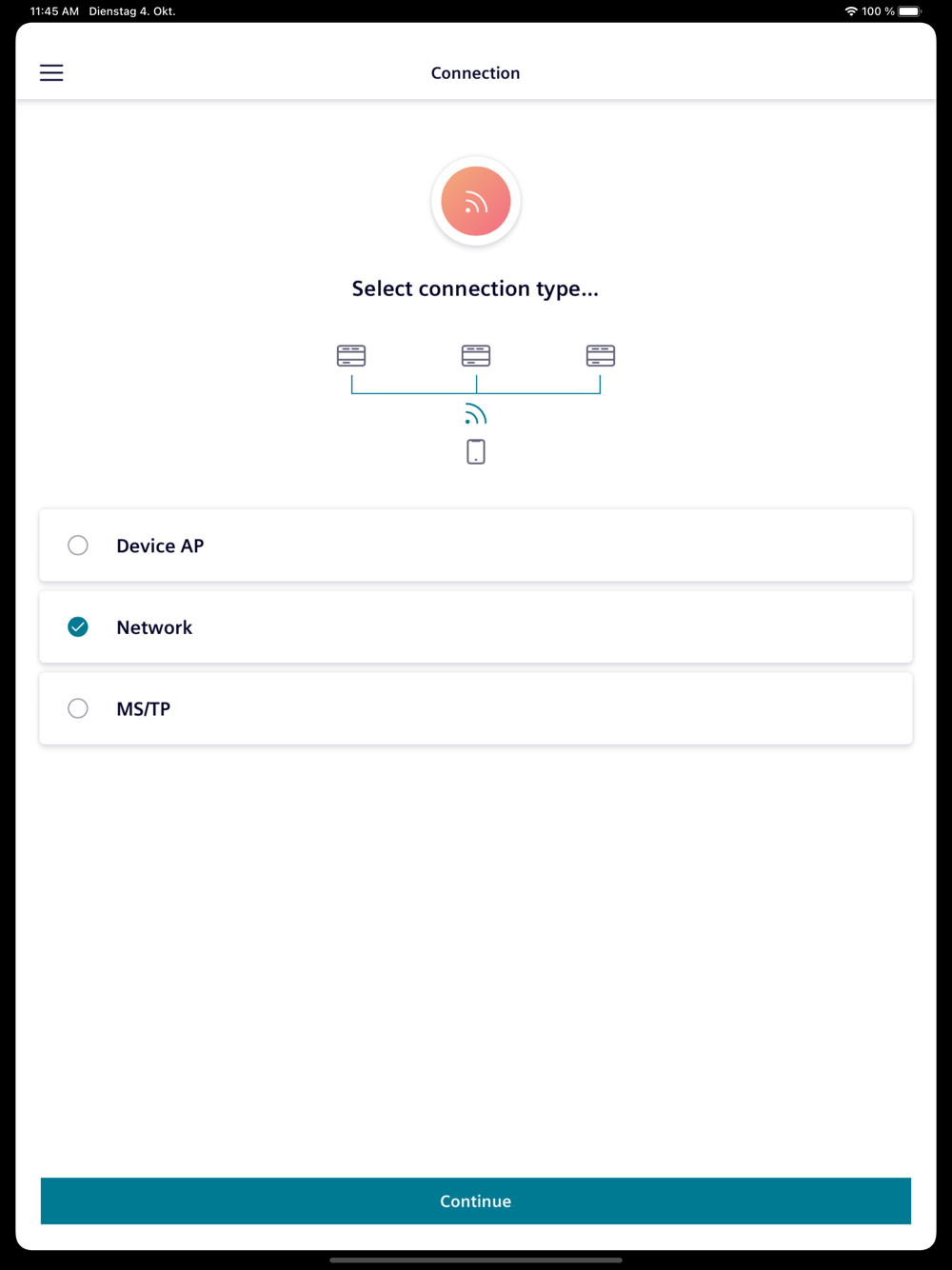• Desigo automation stations (PXC4/5..) for primary plants from Siemens on Ethernet (BACnet/IP) or MS/TP (BACnet/MSTP) or activated device access point (WLAN) ) with application loaded, network setup finished.