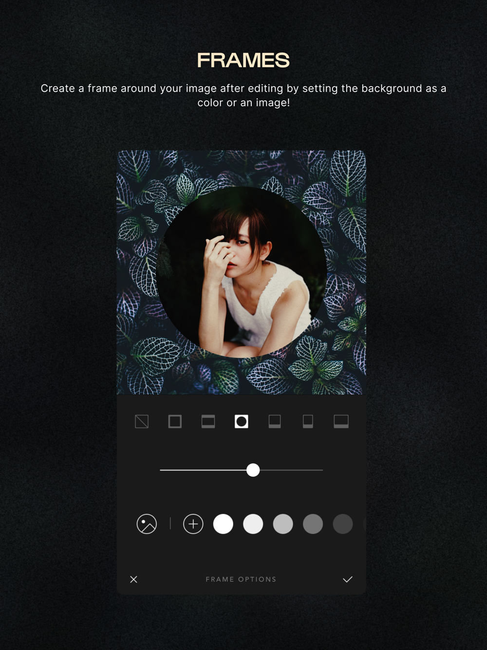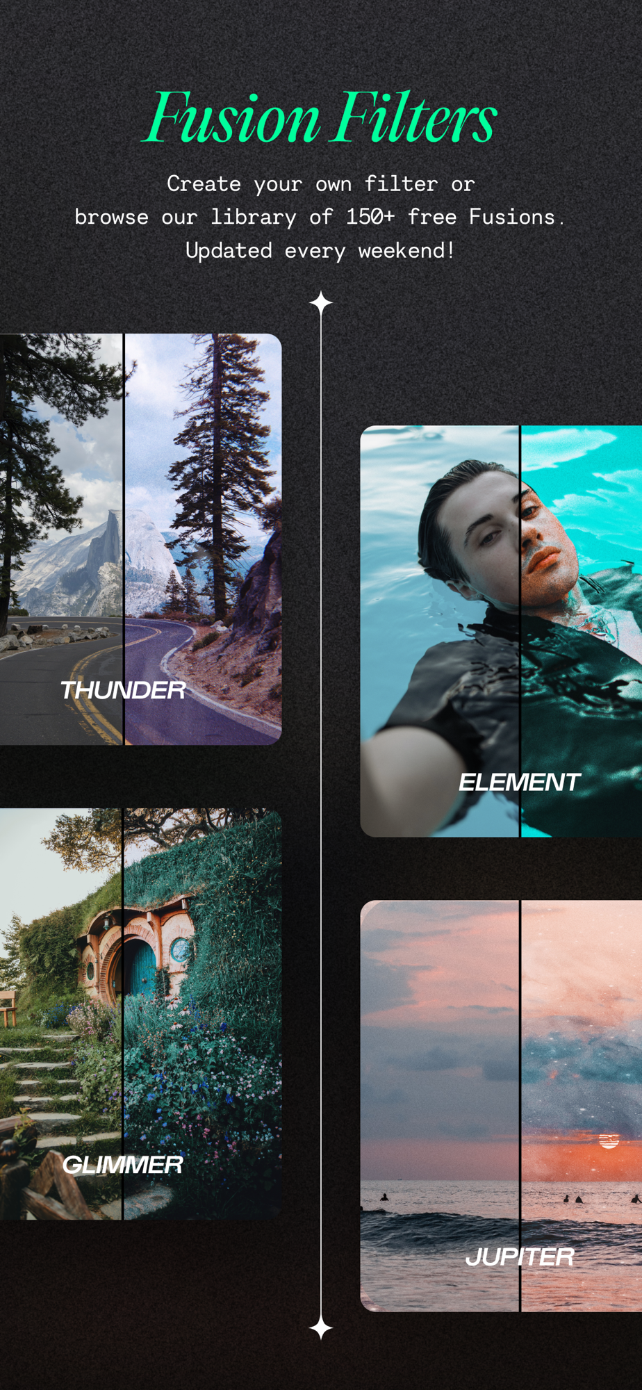Our always-expanding filter library is created by passionate photographers and boasts over 300 unique filters. You’ll never need another app to find that perfect pairing for your photos. (+ a NEW filter added every Saturday until the end of time!)