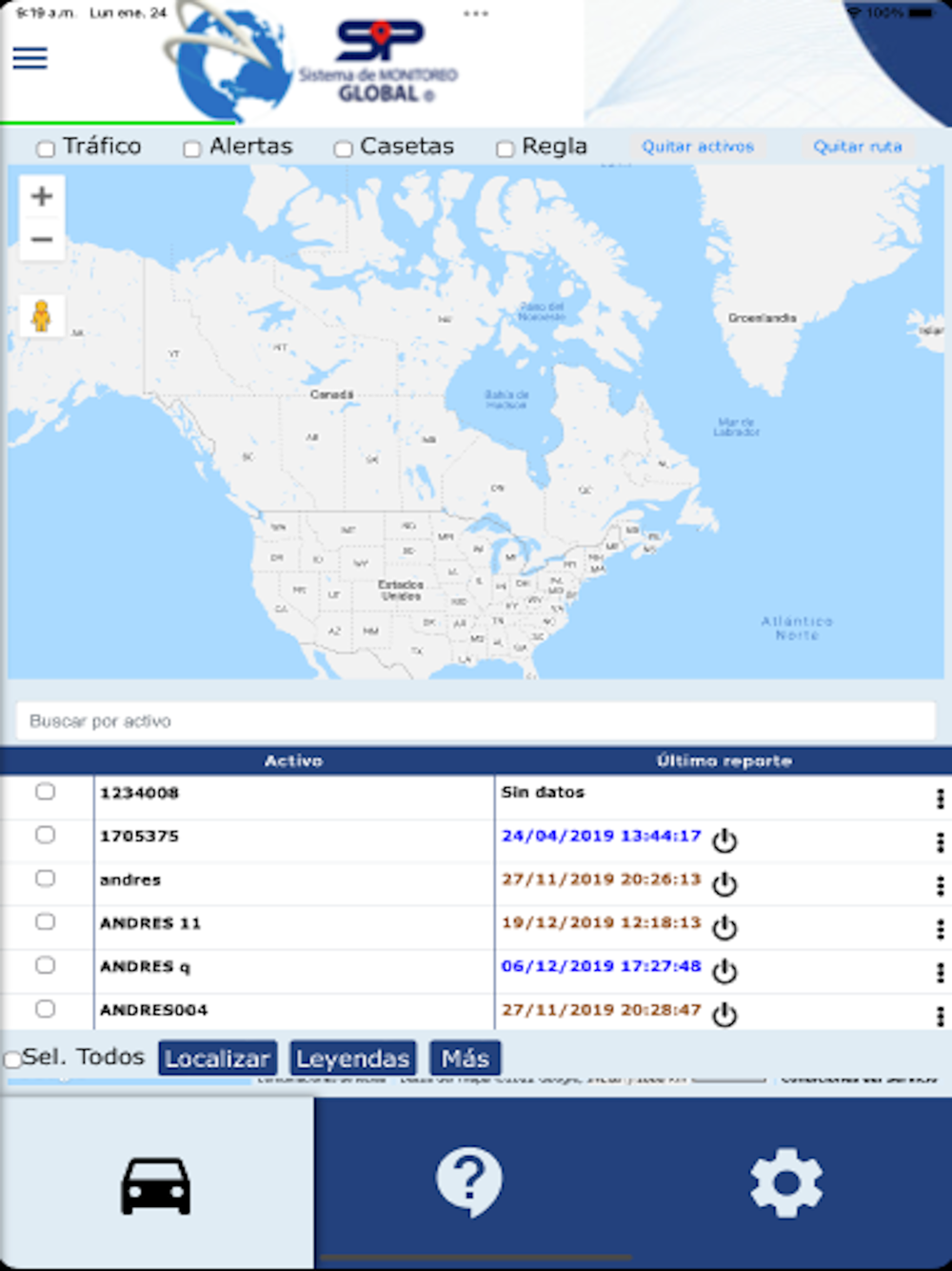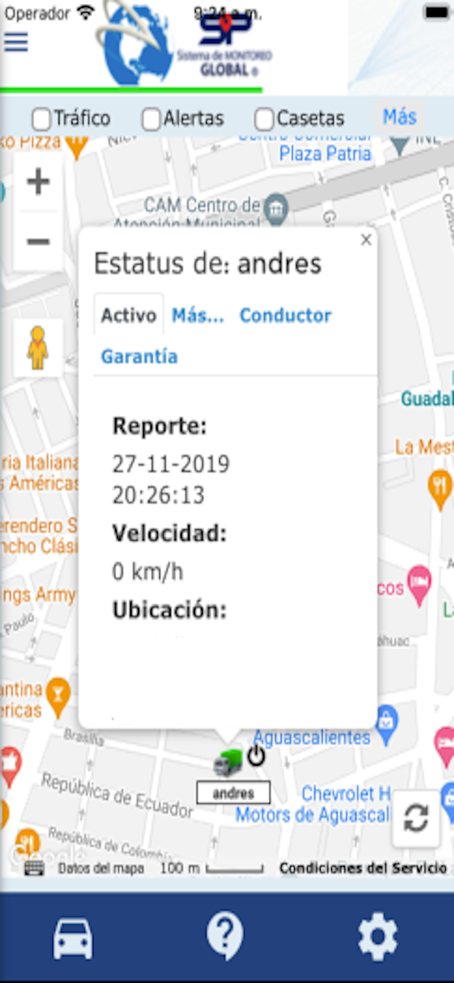 Rastreo de vehículos en tiempo real. Aplicación móvil de la plataforma SP Monitoreo Global.