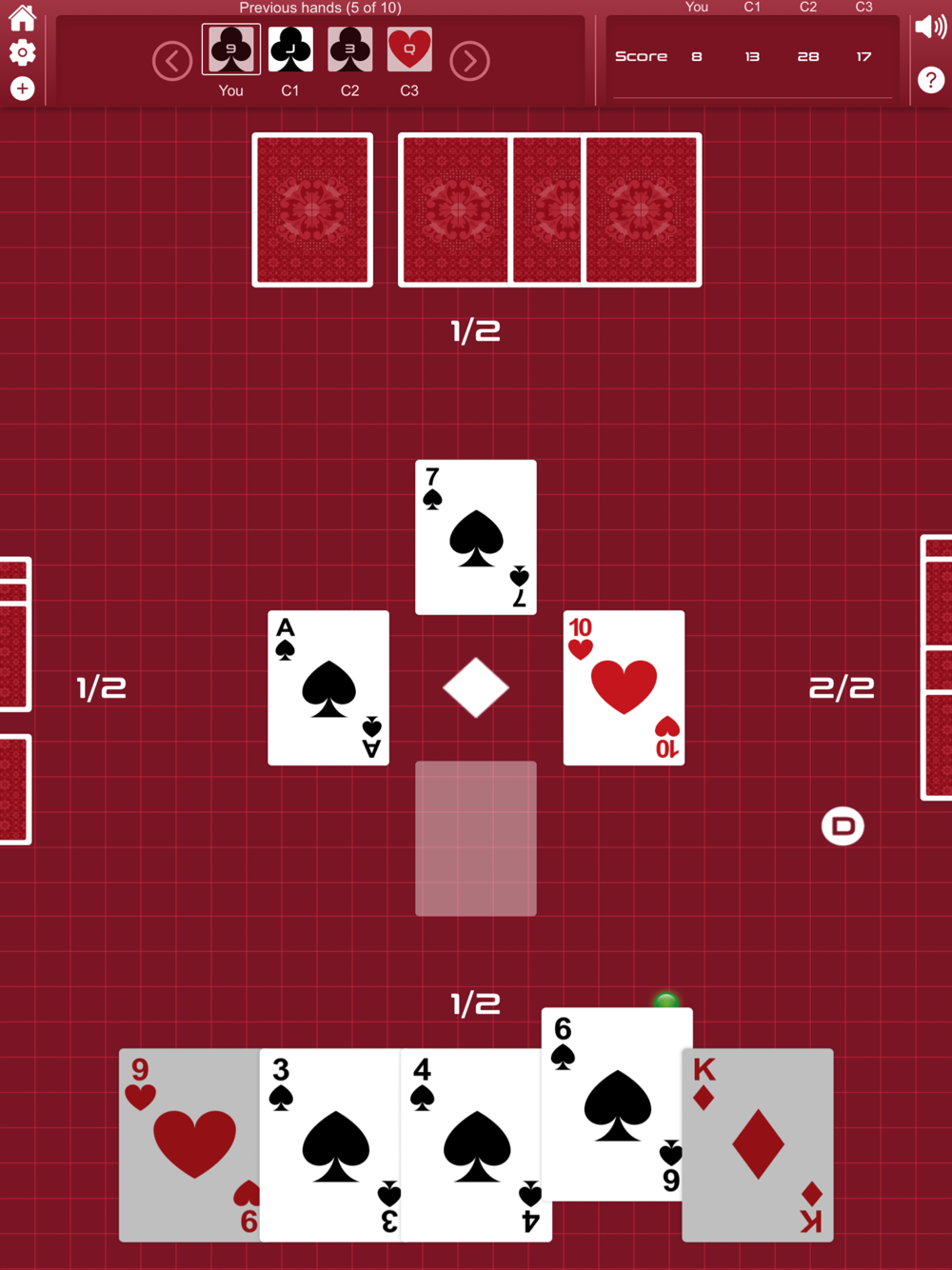 Each trick scores one point, and correctly predicting how many tricks you will win at the bidding stage scores 10 points per round, or 5 if you bid 0 and the ‘Nil Bid Worth 5’ setting is switched on.