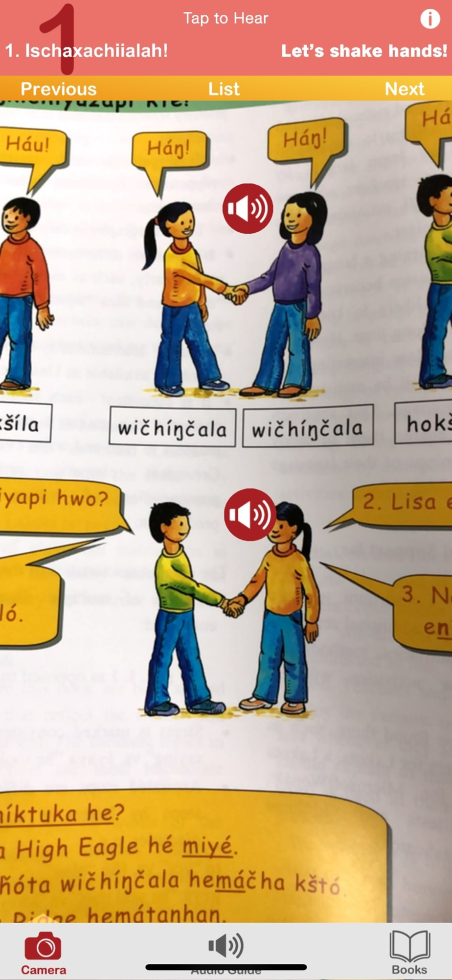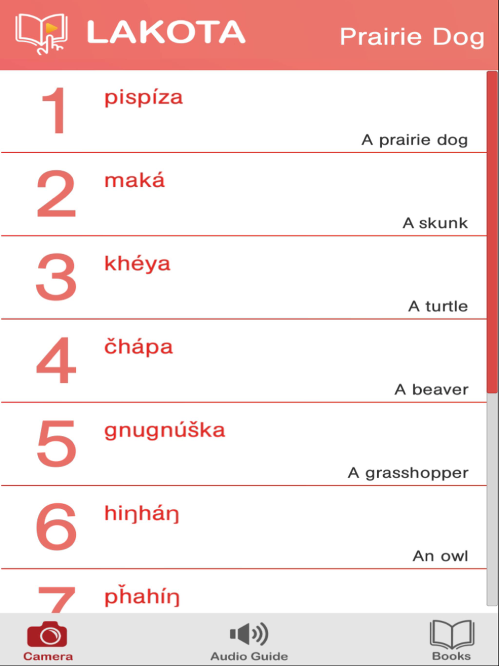 The Lakota Media Player is easy to use. You’ll start out in Books, where you can select and download the content for your Lakota books. The Camera mode lets you use your phone’s camera to put audio content right on the page. The Audio Guide mode has the Lakota spellings, images, English translations and audio, all in one easy tap and swipe interface.