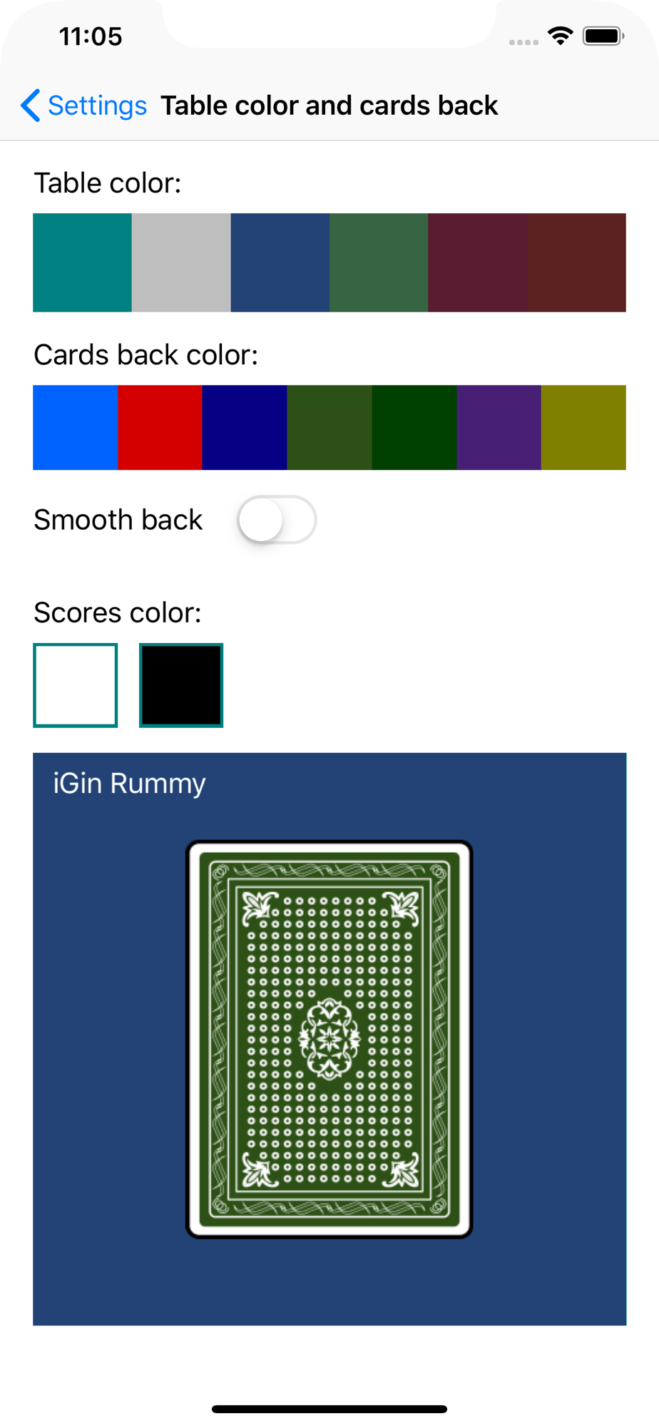 - Settings: Cards size, deck type (four-color or classic), cards back color, sound, animations, speed, scoreboard, table and scores color,...
