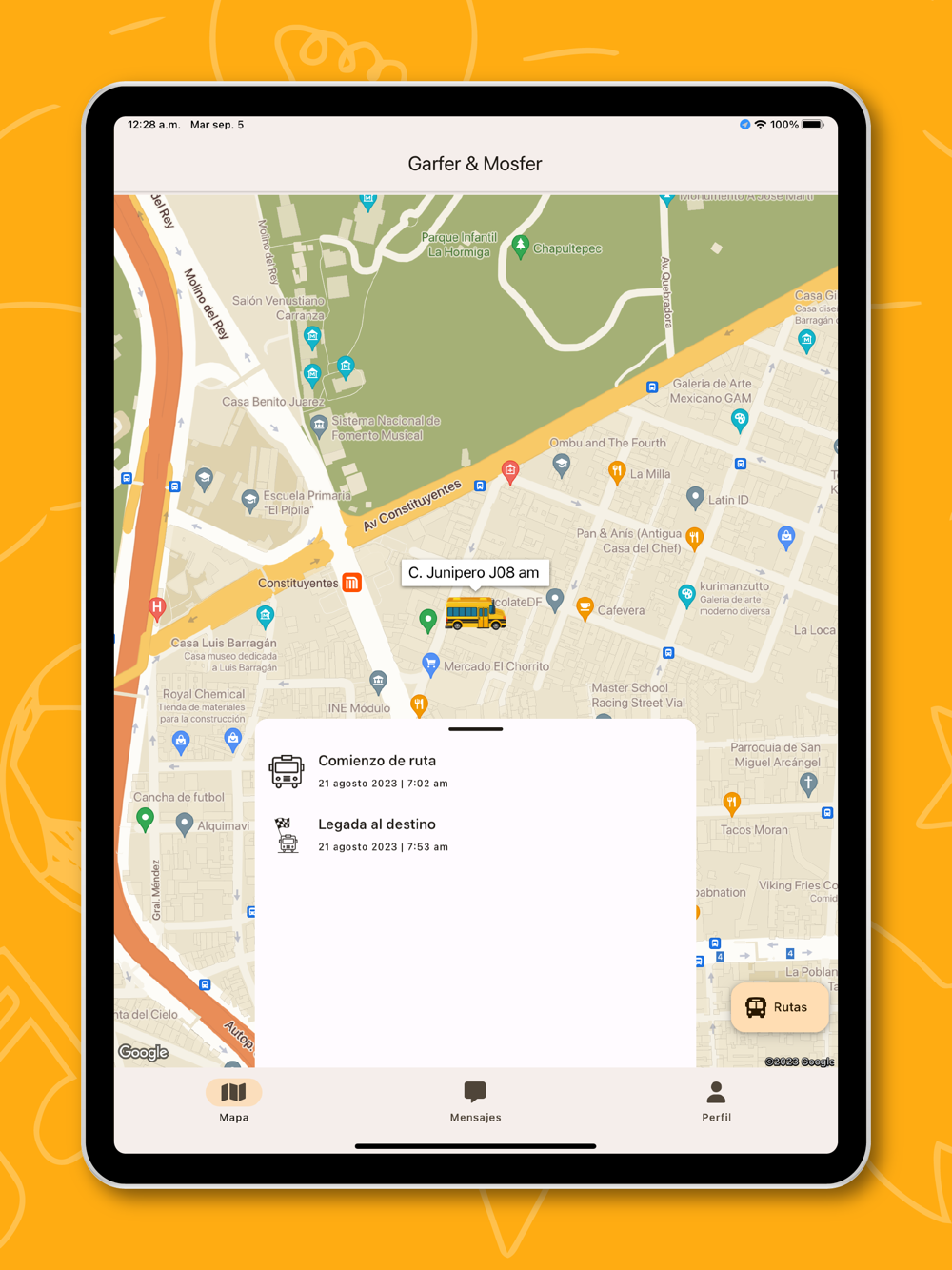 La app GF&MF permite que los padres de familia sigan la ruta del transporte escolar de sus hijos, mediante GPS. El camión se muestra en un mapa que se actualiza en tiempo real. Además, para mayor seguridad, cada vez que la app se abre, es necesario introducir un código. De esta manera, sólo las personas que conocen el código podrán acceder a la información y ubicación de la ruta.
