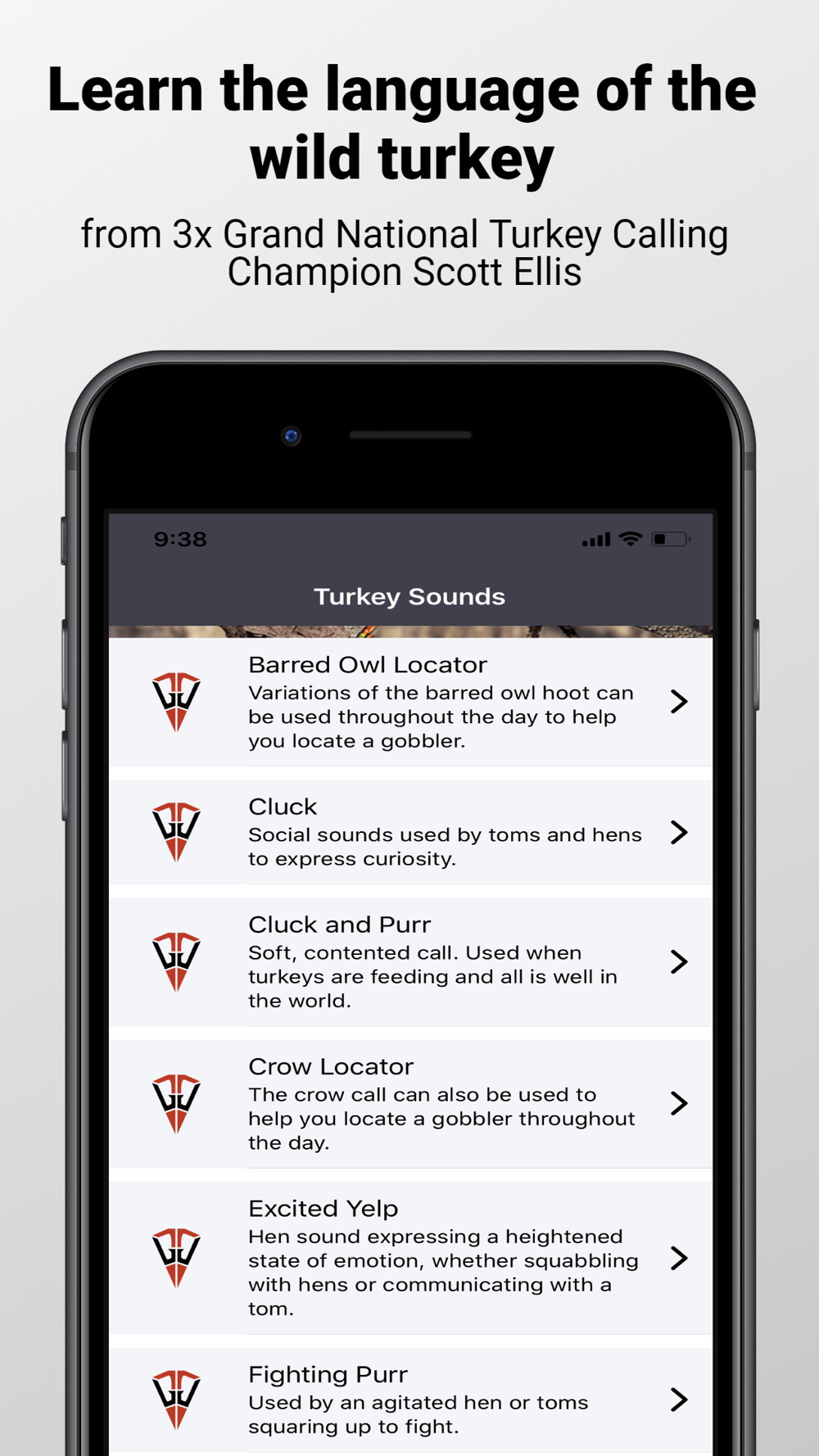 Calls featured on the app (all with how-to video, real turkey audio, and hunting tips for each, including special “Pro Tips”):