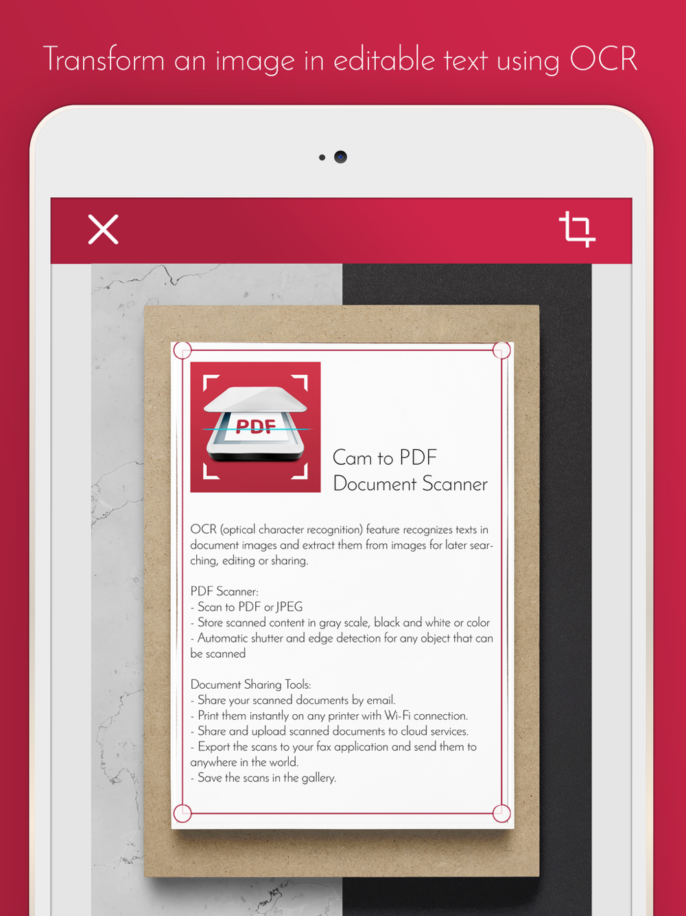 - OCR (optical character recognition) feature recognizes texts in document images and extract them from images for later searching, editing or sharing.