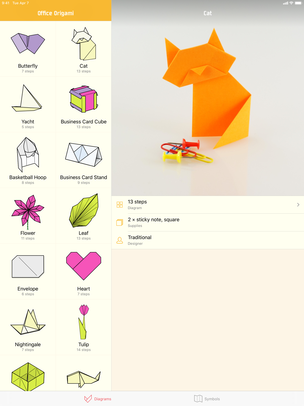 All 25 origami designs include detailed, step-by-step instructions and high-quality photos of the finished product. Each type of origami fold is shown in a precise, visual guidebook included right in the app.
