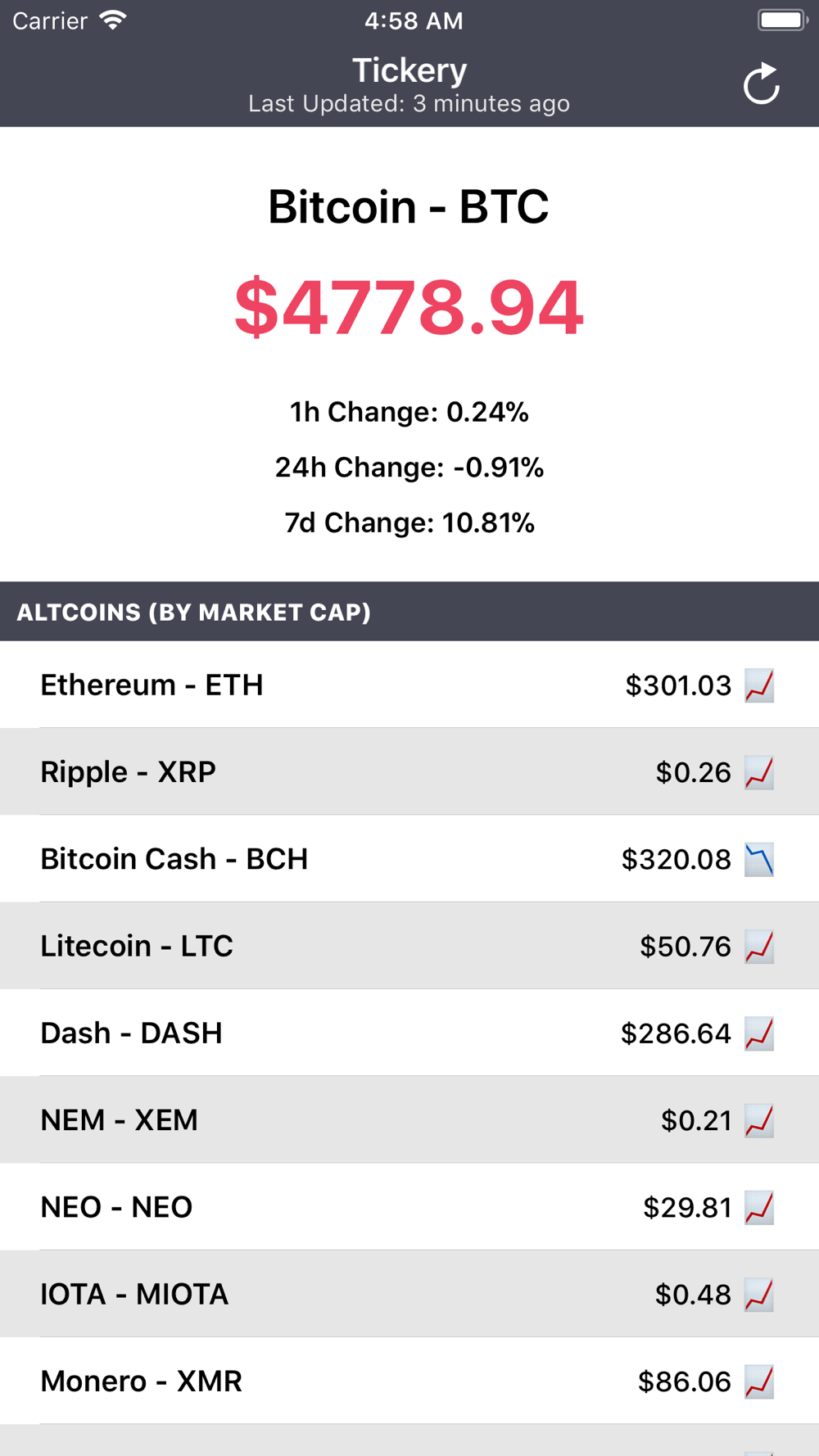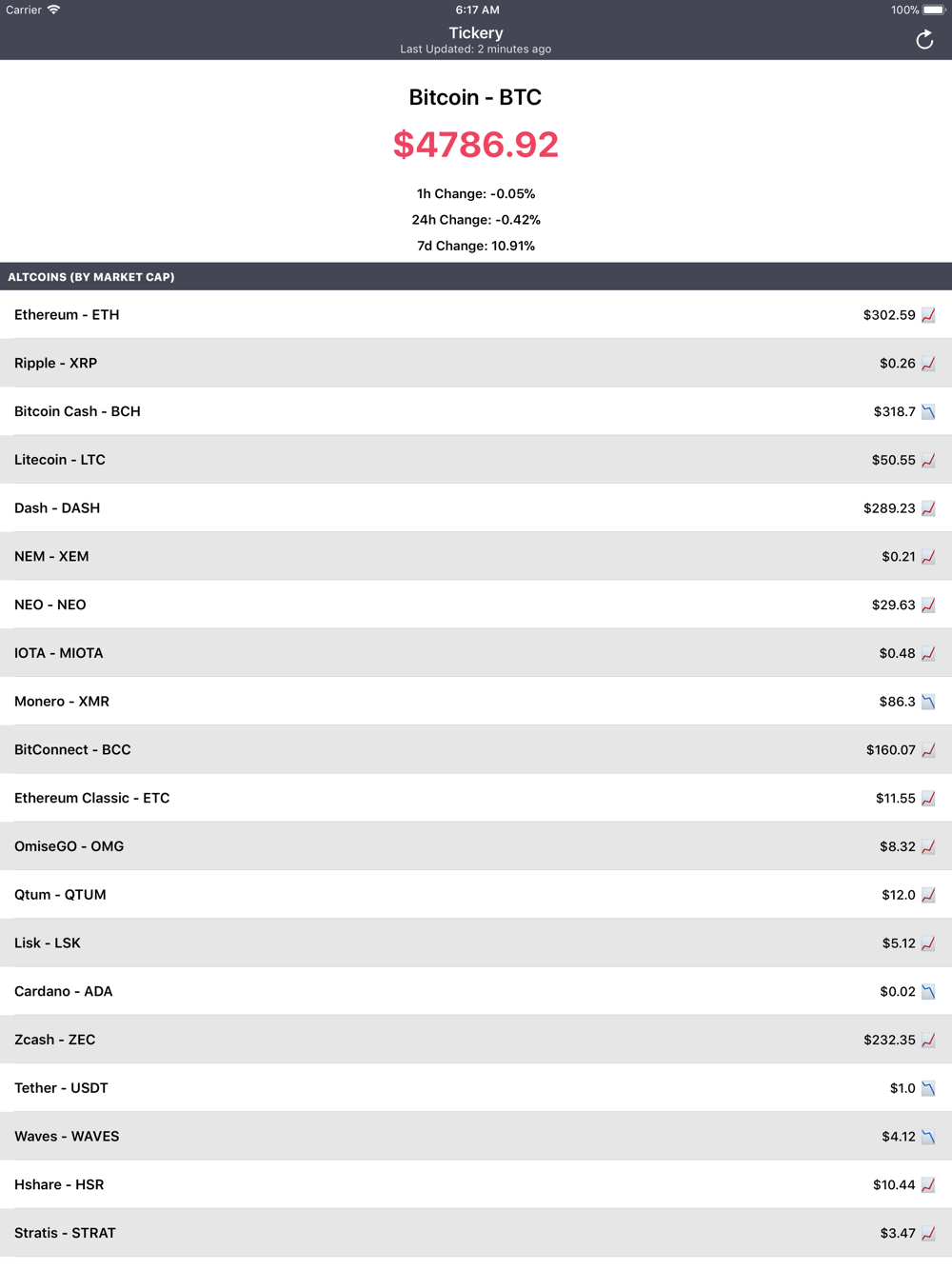 Here's your beautiful Bitcoin and Altcoin ticker. Tickery shows information about Bitcoin and 100 altcoins ordered by market cap. You'll always be up to date with Tickery!