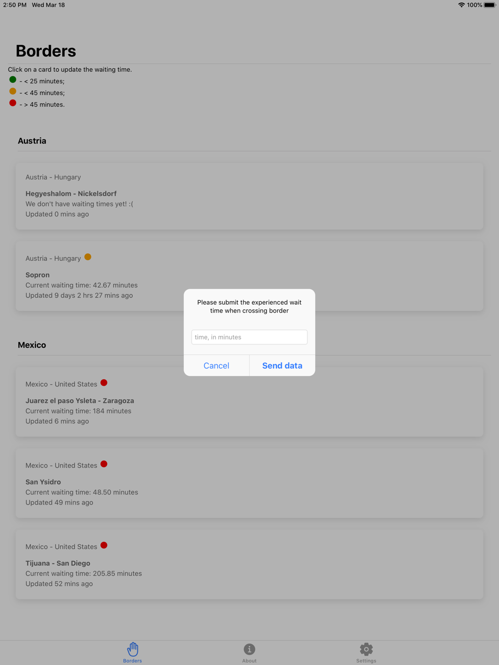 • if official data is not available, users from all around the world can quickly submit their experienced waiting times at the borders they cross, informing users looking to cross borders of the current waiting times.