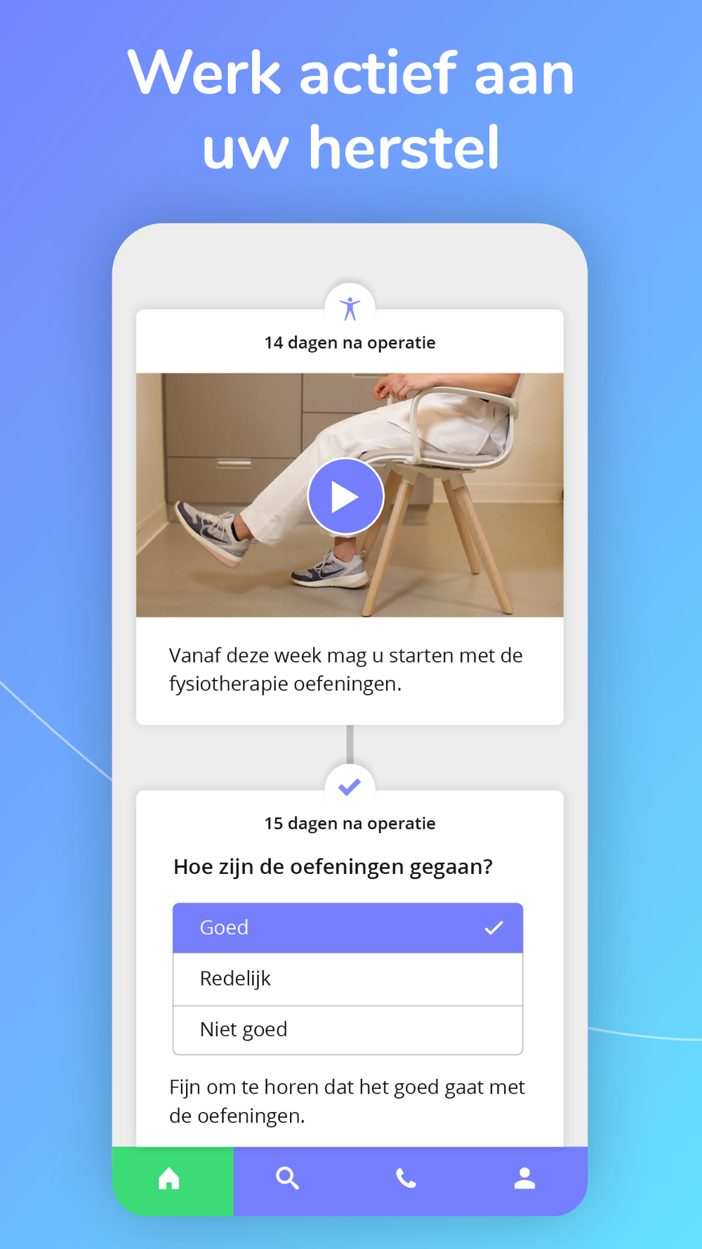 De app stuurt push notificaties over belangrijke handelingen en wanneer nieuwe informatie beschikbaar is. U kunt de app ook gebruiken om uw persoonlijke voortgang bij te houden en gezondheidsuitkomsten als pijn, functie, activiteit, tevredenheid, gewicht, hartslag en kwaliteit van leven te monitoren.