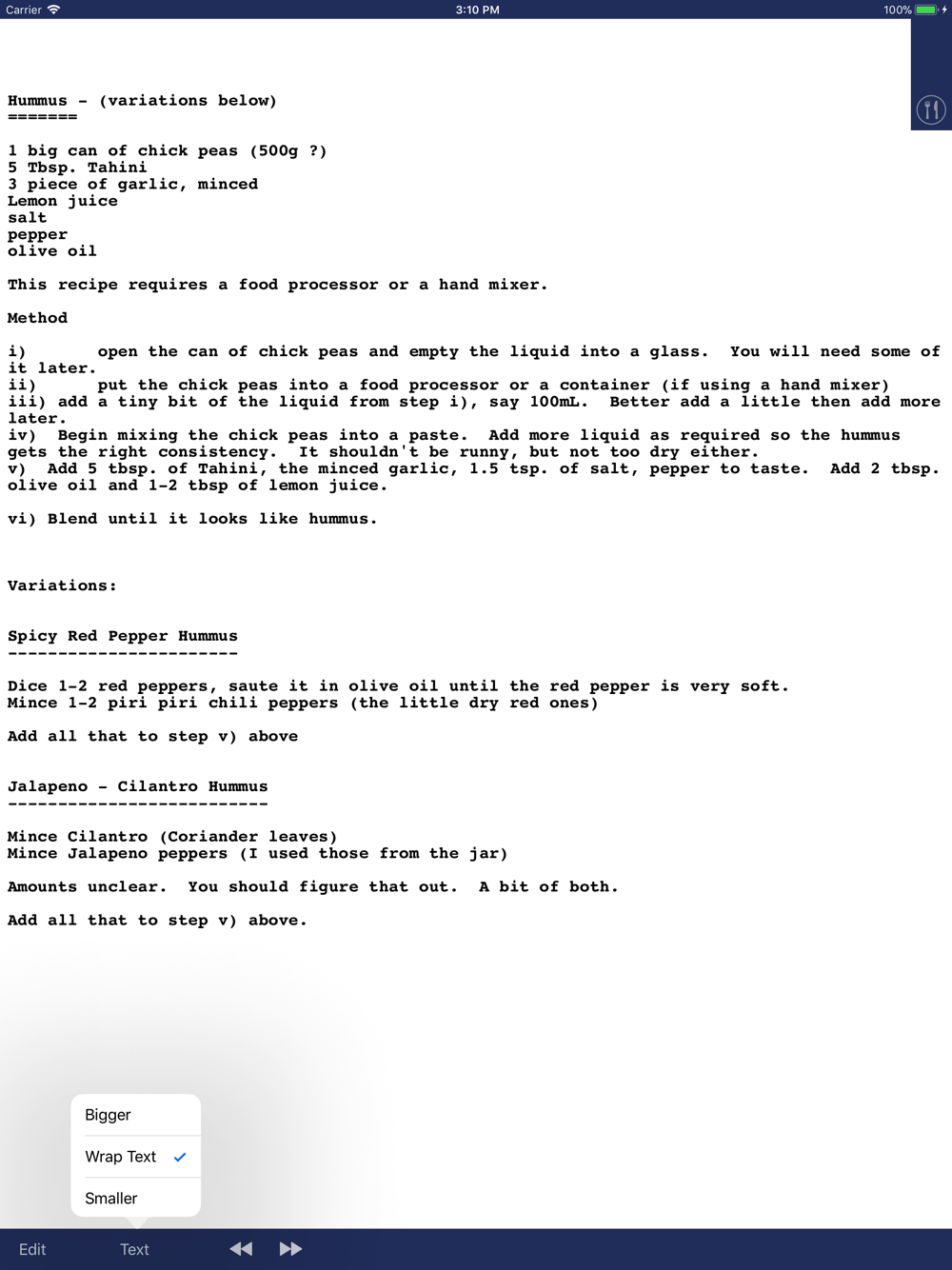 Really, really simple. It's your digital recipe box for all your cooking recipes. Very few frills, no advertising, just an easy way for you to keep track of all your recipes that also make it easy to find them. You can use simple text, or you can even take pictures of recipes you've seen and keep them that way, or import PDF files if that's how you like to document your recipes. You can make lists, and also add your recipes to any category you choose.