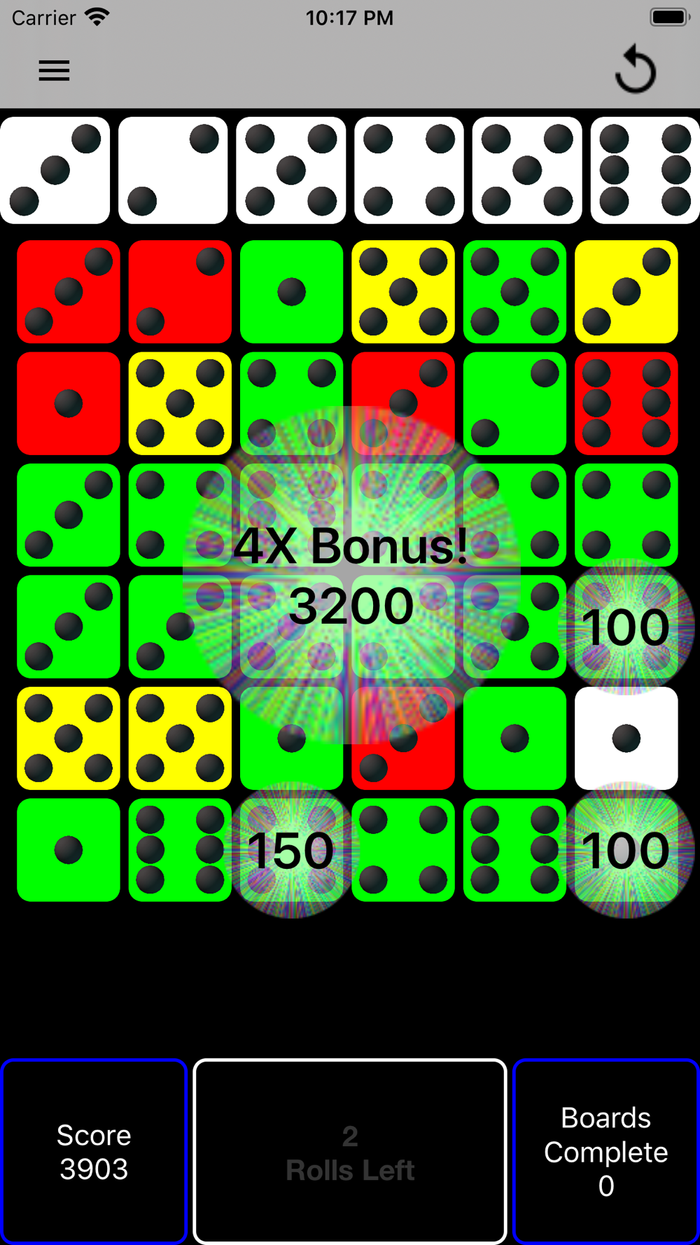 Rows can be completed vertically, horizontally and diagonally from corner to corner. Every time a row is completed you will score bonus points - 100 for a horizontal row, 150 for a vertical row and 200 for a diagonal row. When you complete more than 1 row simultaneously, you score a 200 point bonus for each row completed in that turn. If you complete the entire board, you will score a 1000 point bonus plus an additional 1000 points for every roll remaining in the game.