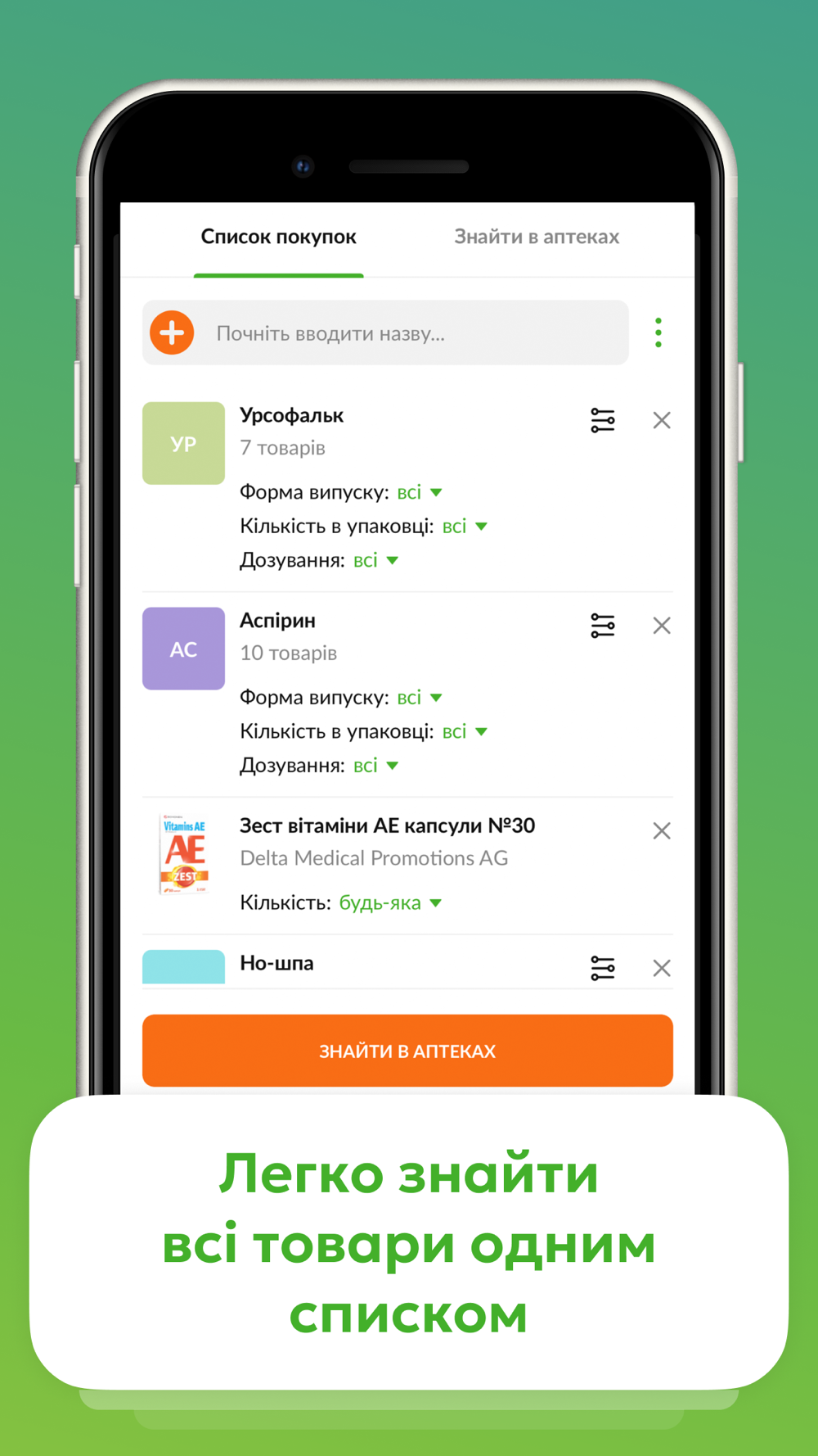 • не потрібно ходити по аптеках і шукати товари – додаток знайде найближчі аптеки, перевірить наявність товару і покаже все на карті із зазначенням ціни;