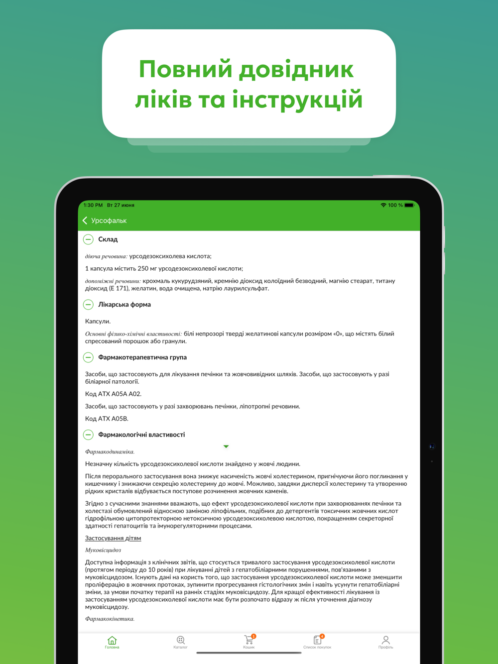 • є повний довідник ліків, з детальним описом: склад, показання, протипоказання, застосування, зберігання тощо.