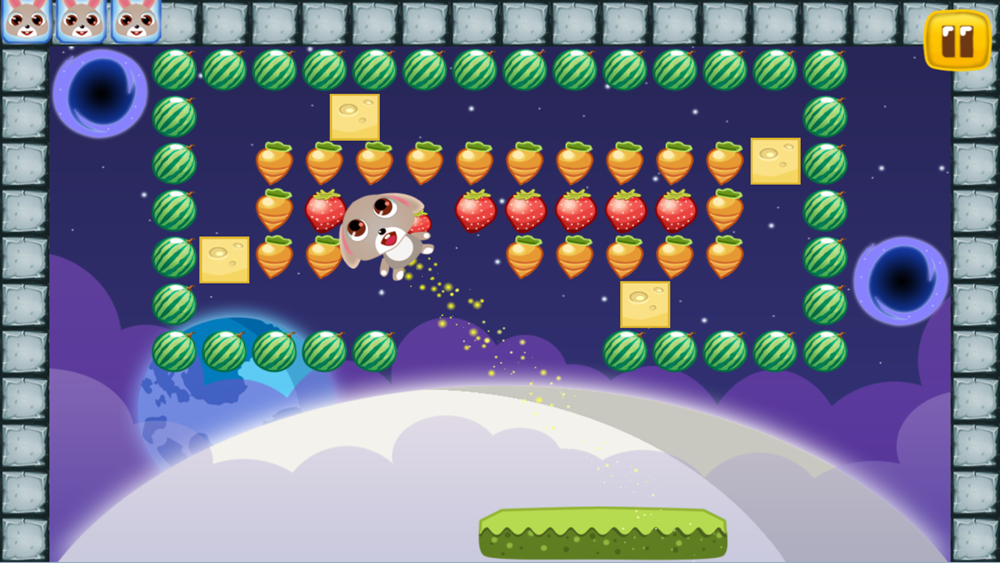 The game consists of 4 worlds and sublevels. Each new world opens up new possibilities. In the first, a rabbit can simply push off from the walls. The second world is space, it has portals, moving platforms and more. The third world - icy, blocks of ice can be broken - have to bricks break and get to the coveted fruit. The third world is magical, in it there are increasing and decreasing objects. To get to the bottlenecks you need to shrink and climb.