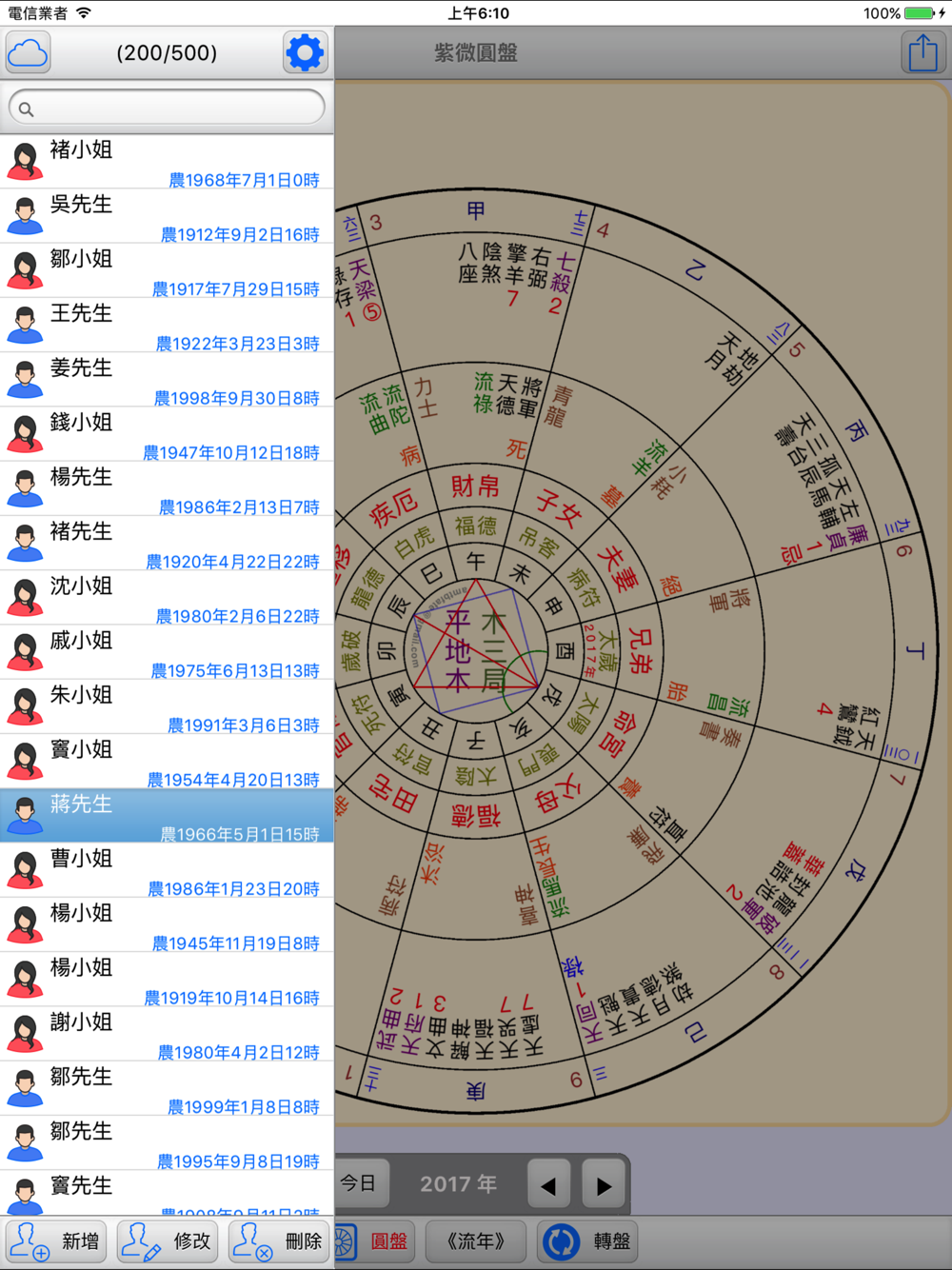 ●圓盤:包含紫微圓盤、姓名、出生日期陽曆及農曆、流年、命身主、命身宮...等,提供雙指縮放大小、按住恢復大小。