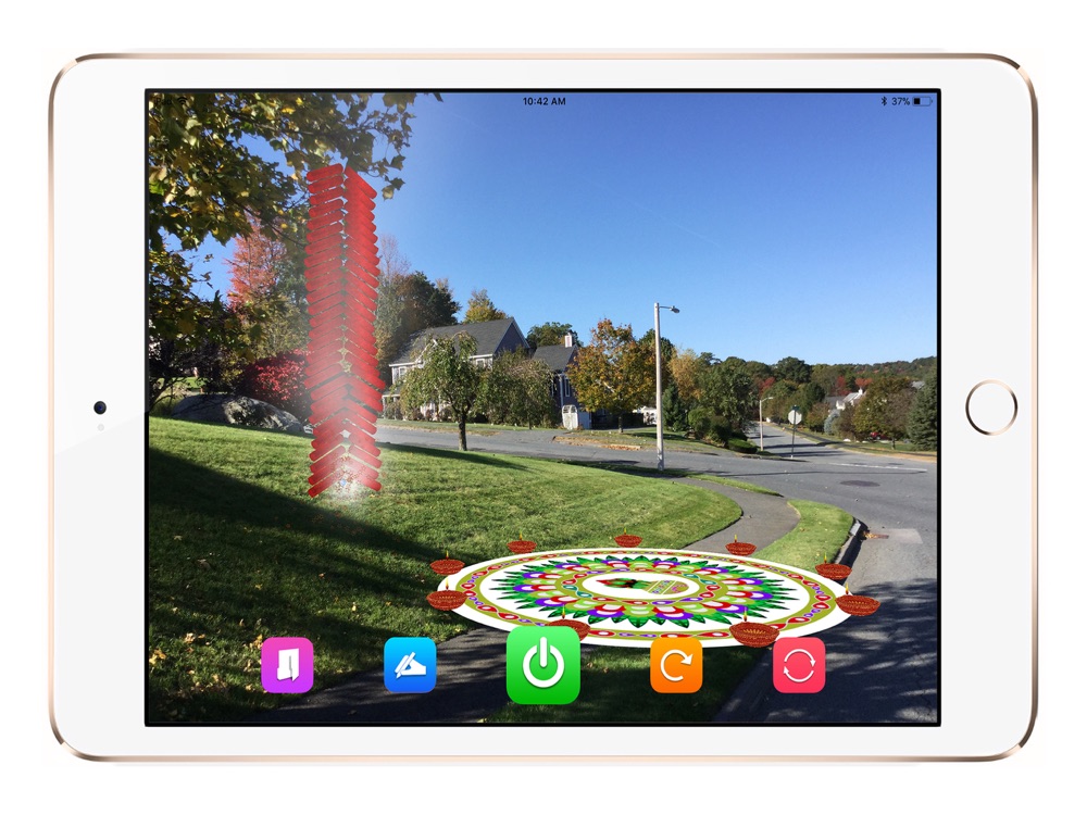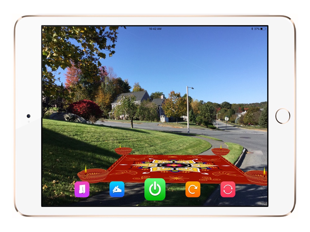Through easy-to-follow instruction, a user selects the picture from his/her iPhone/iPad photo album and augments the picture image with best wish text, (Hindi, english, and other languages), rangoli art, and playing firecracker. Or a user uses the live iPhone/iPad camera input and augments the camera input with memorizable text, (Hindi, english, and other languages), rangoli art, and playing firecracker. After the image augmentation, users can save the images of treasure moment and can share the images with friends and family!