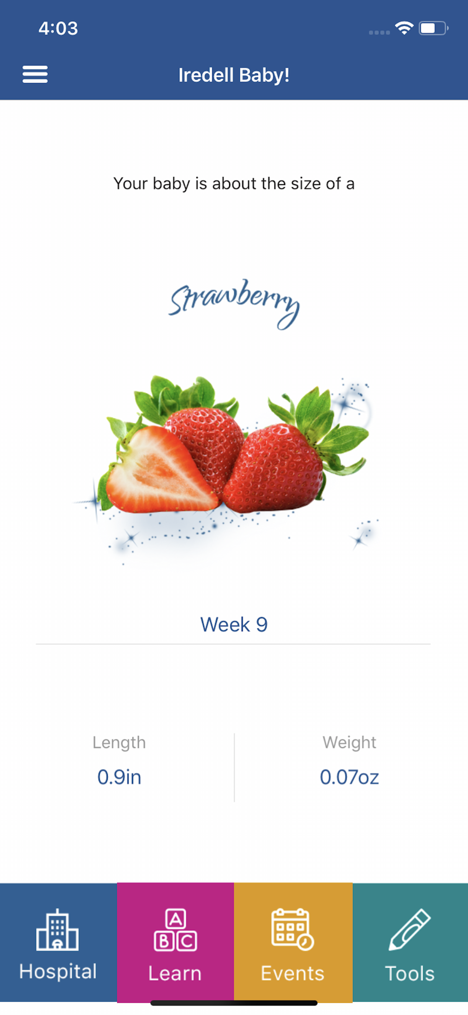 Iredell Baby! — the free pregnancy app from Iredell Health System — is the perfect way to track your baby’s growth and developmental milestones for both mom and baby throughout pregnancy. Time contractions, count kicks, prepare your packing list, sign up for classes, preregister for delivery and more! Continue to follow your child’s developmental milestones once baby is born with even more tools to help you as a parent, including a growth tracker and places to log feedings and diapers. Filled with useful resources, Iredell Baby! provides you with everything you need for pregnancy and your child’s first year of life!