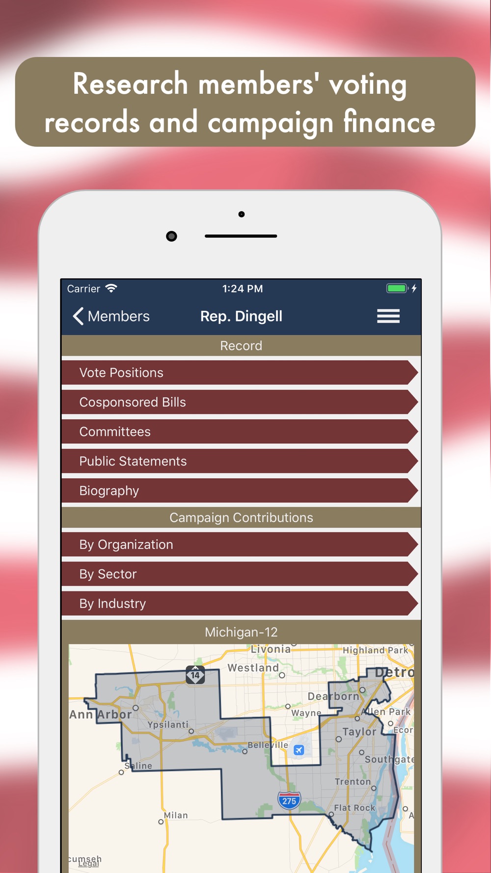 + research members' voting records, press releases, sponsored legislation and campaign finance information