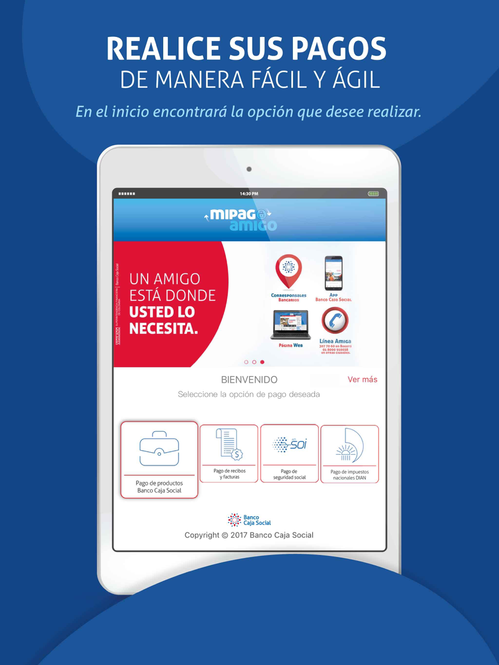Banco Caja Social presenta mipagoamigo, una aplicación desarrollada para dispositivos móviles para realizar el pago de sus facturas, recibos, seguridad social y otros servicios de una manera fácil, ágil y segura.