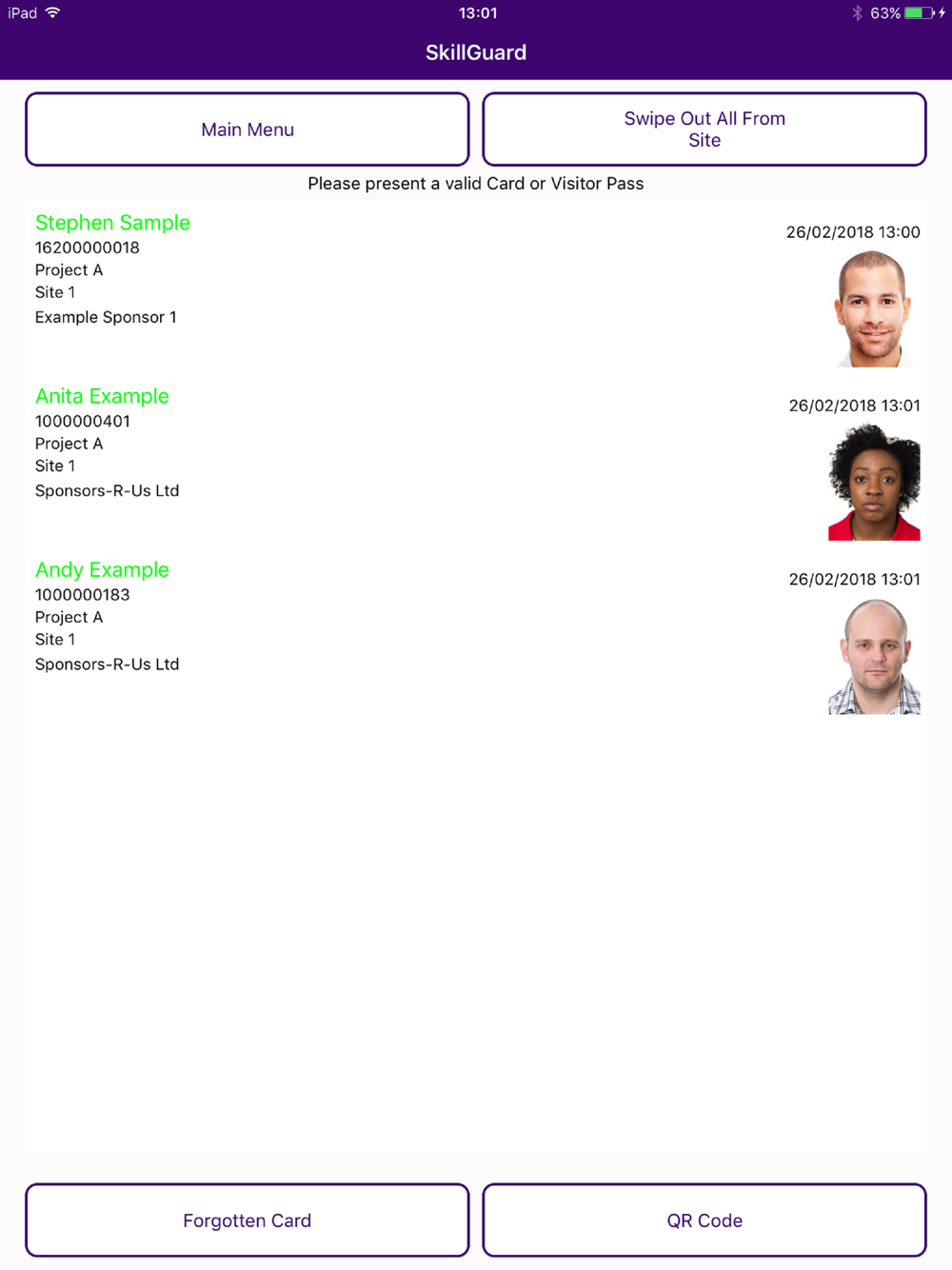 This app allows card reads and visitor pass checks to be facilitated using the unique QR code printed on the front of the SkillGuard smartcard or on the visitor pass.