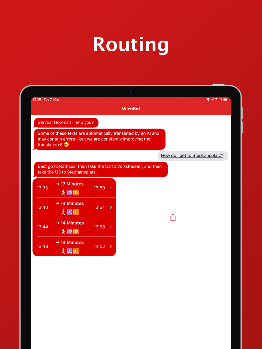 "How do I get to Stephansplatz?" WienBot not only shows you how to get to your destination as quickly as possible, but also when the next public transport services will take you there.